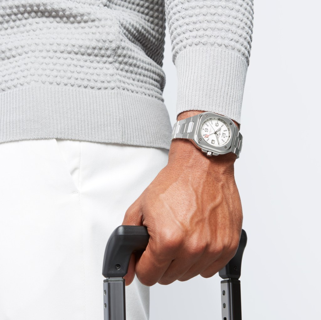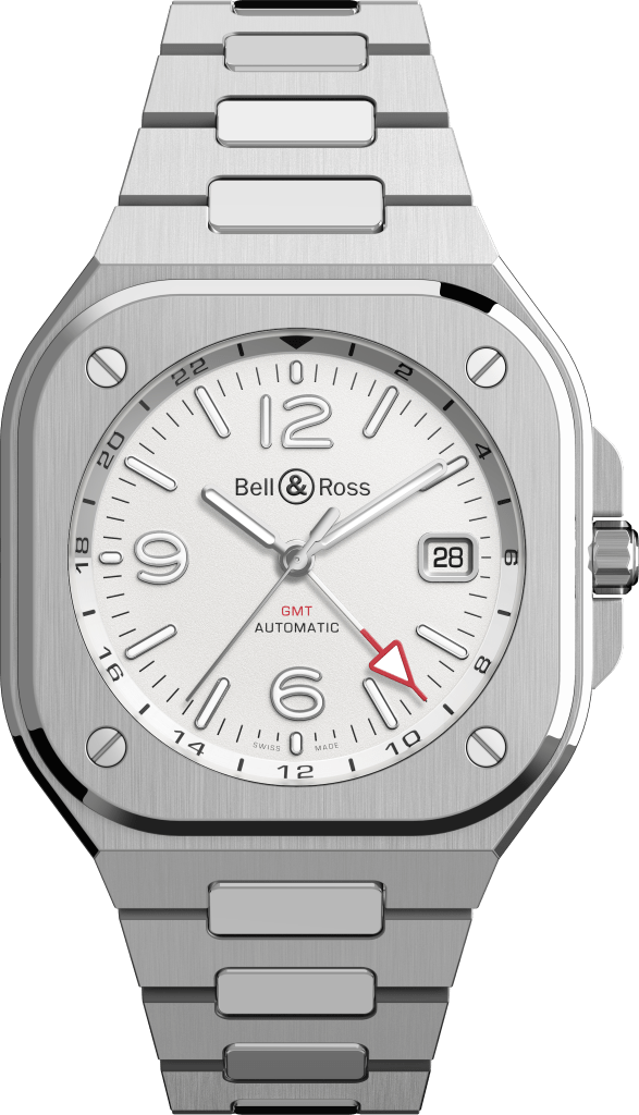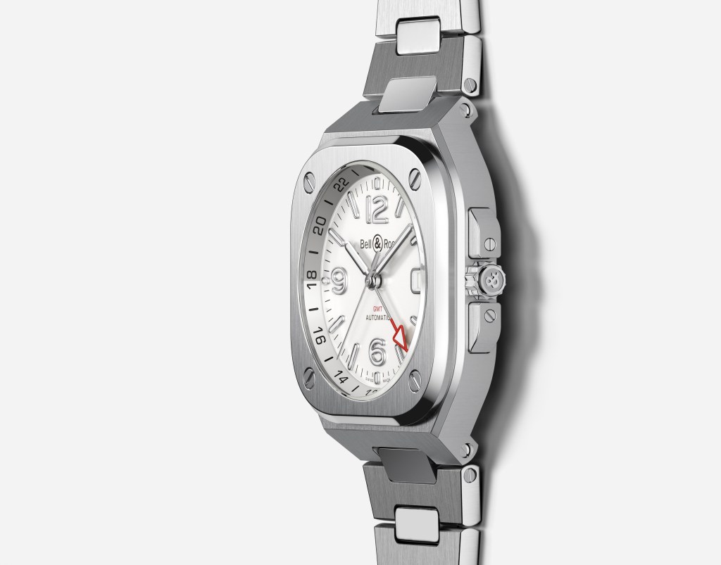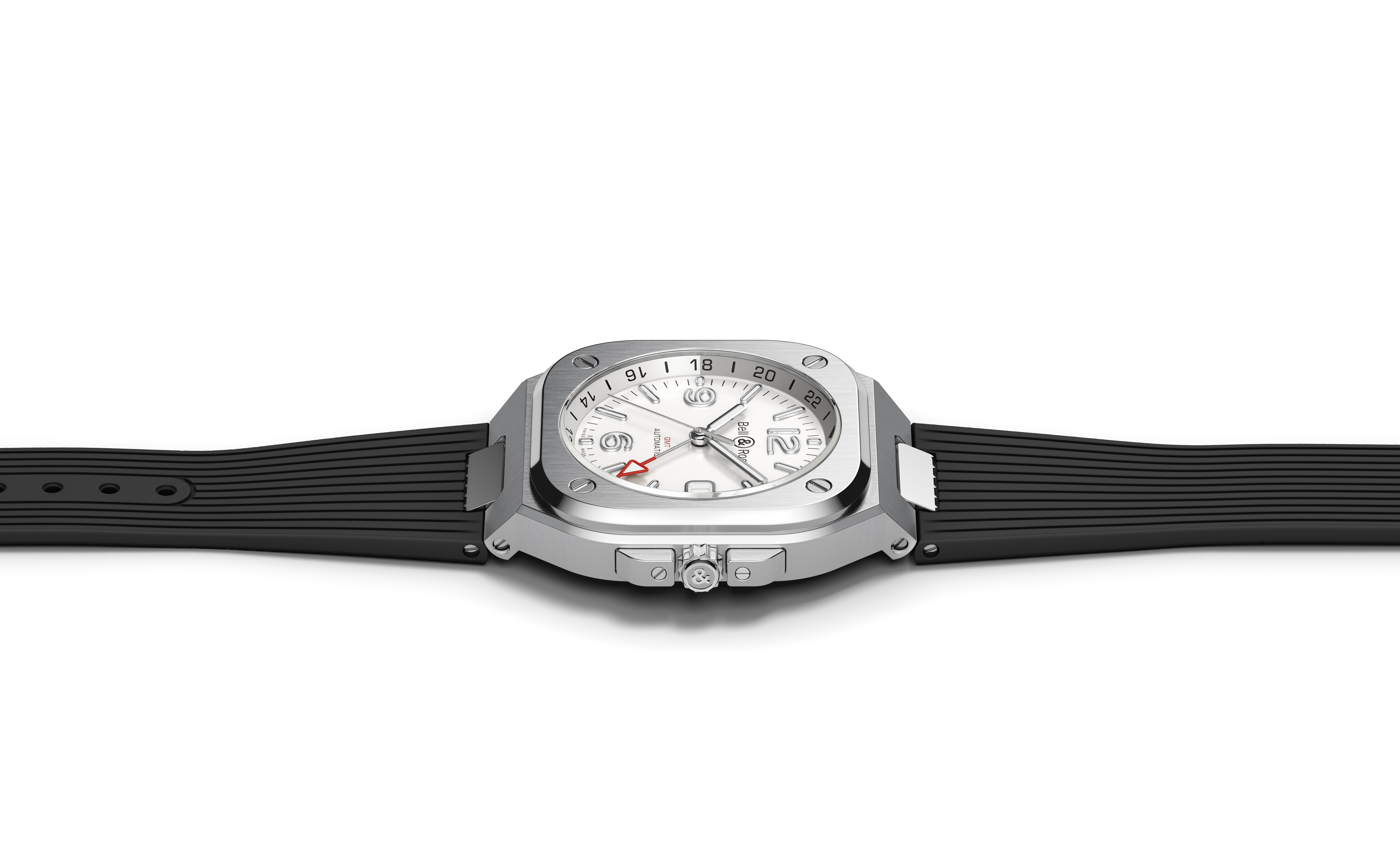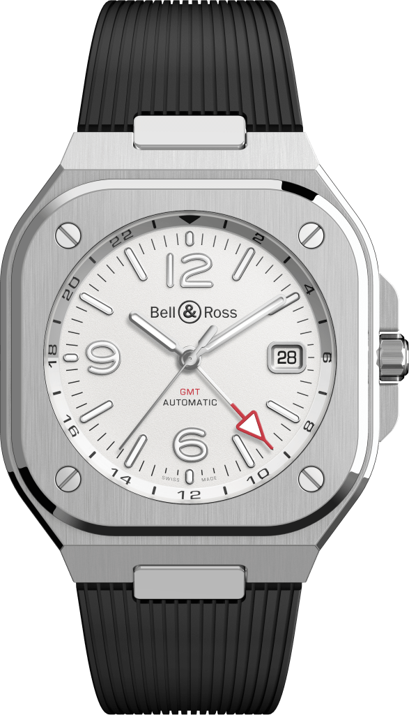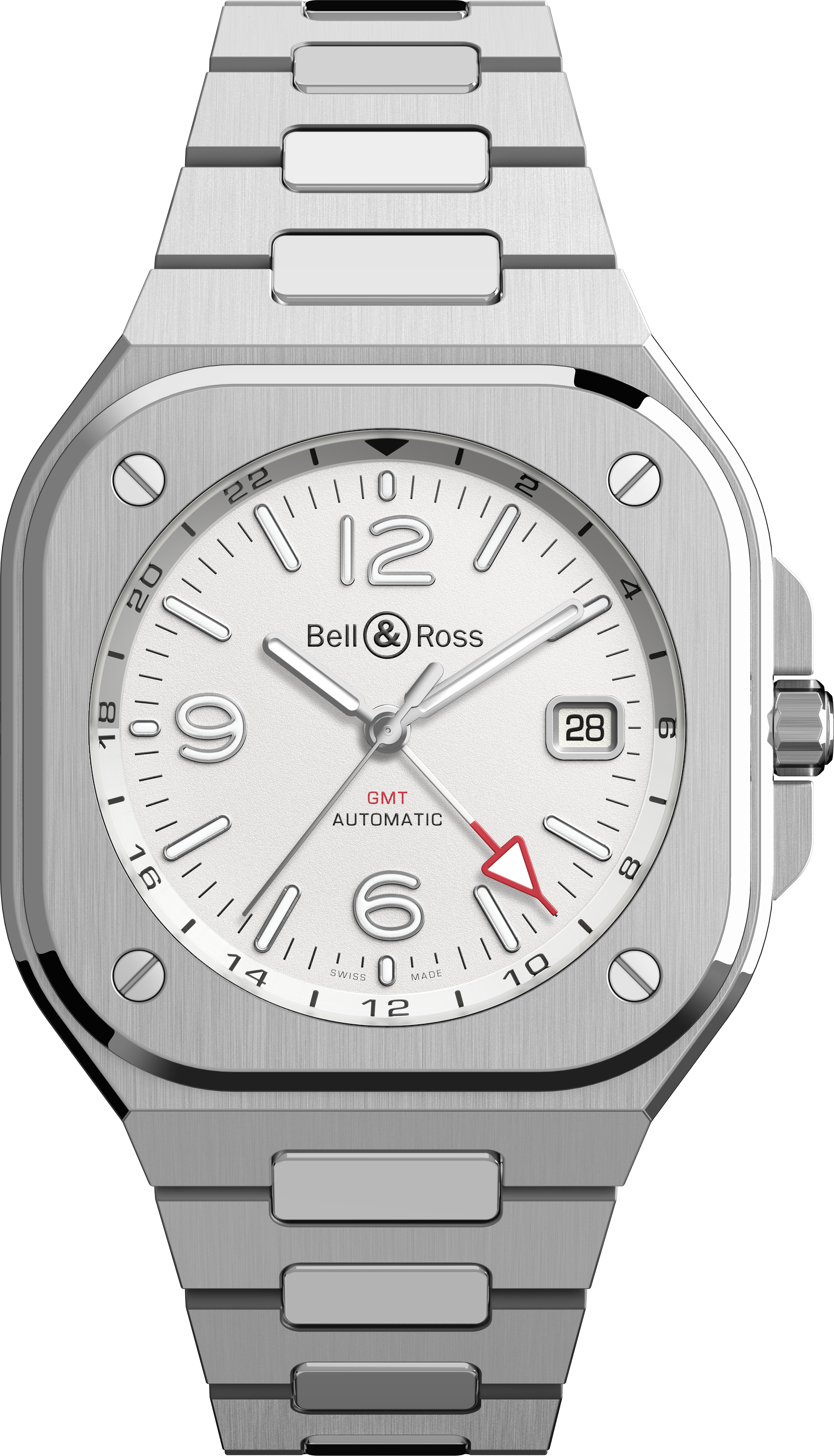 La complicación GMT se incorporó a la gama BR 05 desde 2021. La nueva familia traslada las piezas de inspiración aeronáutica de la marca a un nuevo escenario urbano, en el corazón de la ciudad. Su diseño adopta la icónica forma de «círculo dentro de un cuadrado» de la marca, pero en una versión sofisticada y atenuada. Los ángulos son redondeados y el brazalete se integra en la caja. Los dos elementos forman un conjunto elegante.