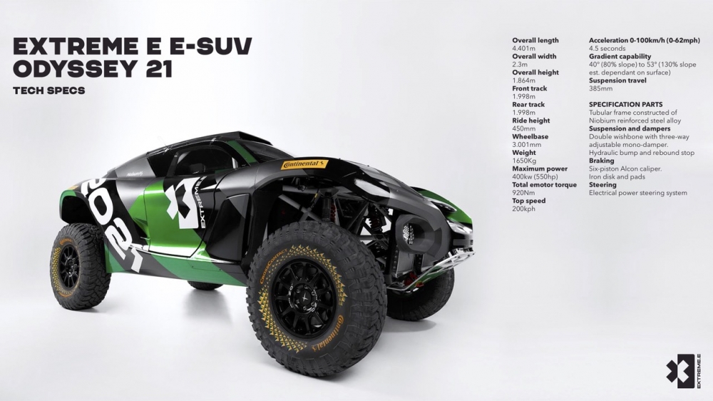 Los coches del campeonato son una flota de diseño único, un SUV totalmente eléctrico, llamado ODYSSEY 21. Para soportar las duras condiciones a las que se enfrentará, la potencia máxima de 400kw (550bhp) del coche puede hacer que el e-SUV de 1.780 kilos y 2,3 metros de ancho pase de 0 a 62 mph en 4,5 segundos, con pendientes de hasta el 130%.