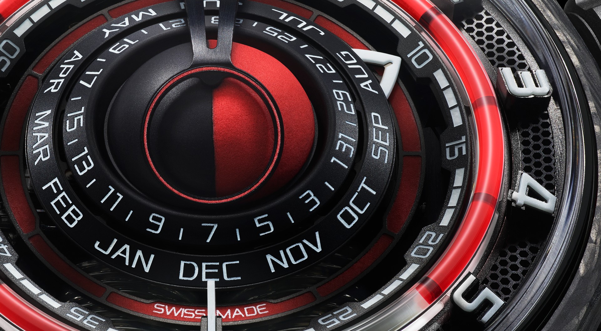 En el corazón de la caja de 48 mm de diámetro, 52,3 mm de longitud y 21,8 mm de grosor, fabricada en hidrocarburo y titanio, parcialmente revestida de rojo, y rematada con una cúpula de cristal de zafiro con revestimiento antirreflectante, la esfera negra y roja, con un índice aplicado en 3D y números luminiscentes blancos, deja al descubierto su intención y otorga un gran protagonismo a la representación del cuerpo lunar.