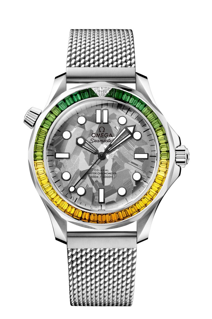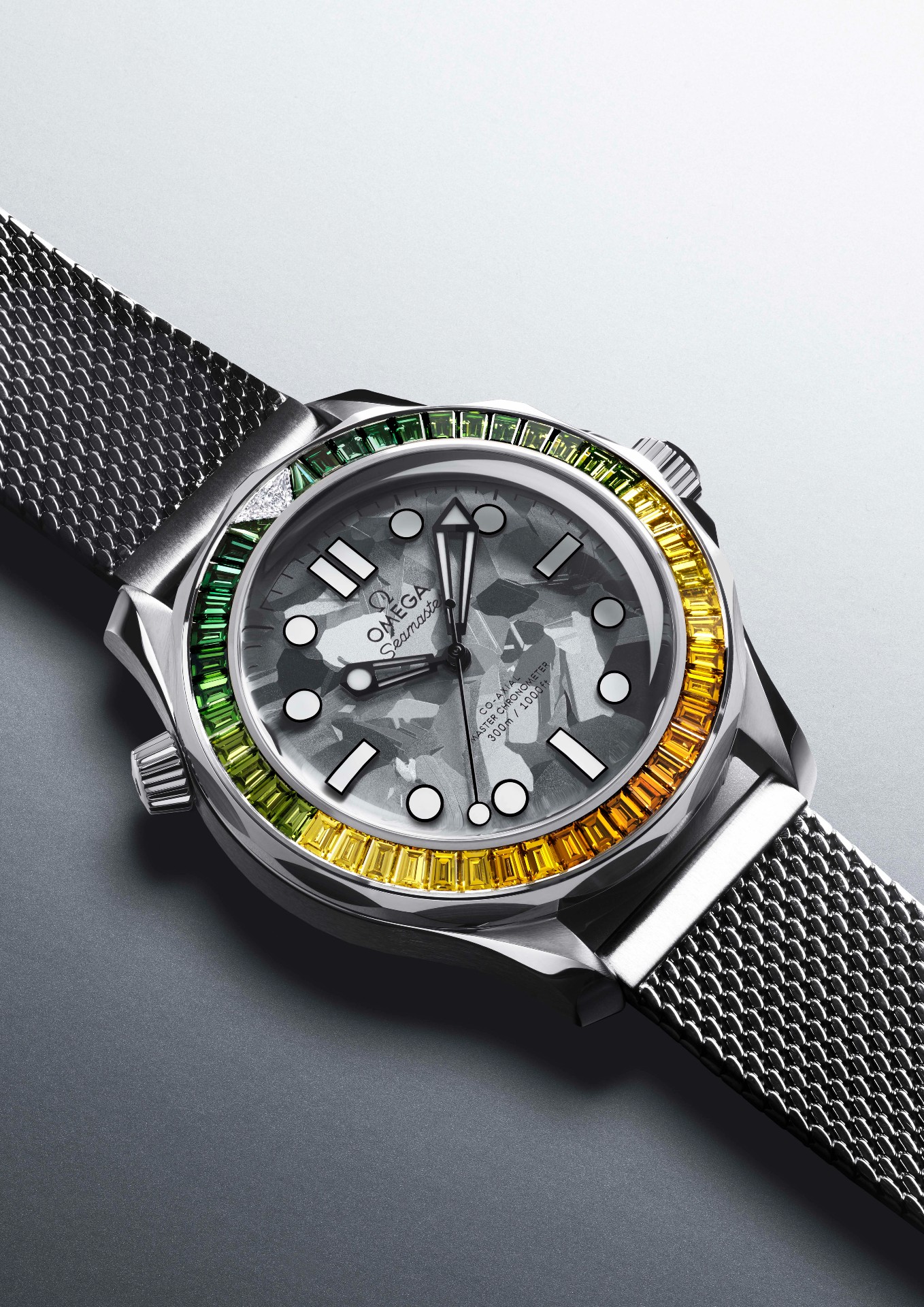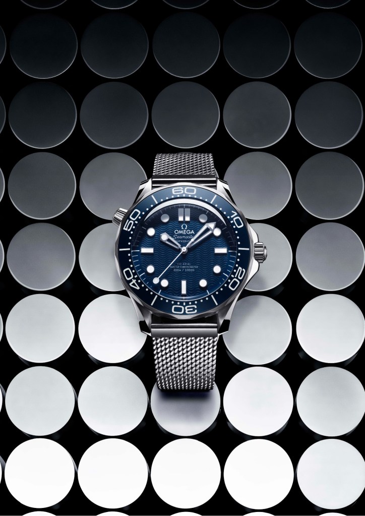 El reloj está impulsado por un preciso Calibre 8806 Co-Axial Master Chronometer y se presenta con un brazalete tipo malla, del mismo estilo que el reloj Omega de James Bond en No Time To Die.
