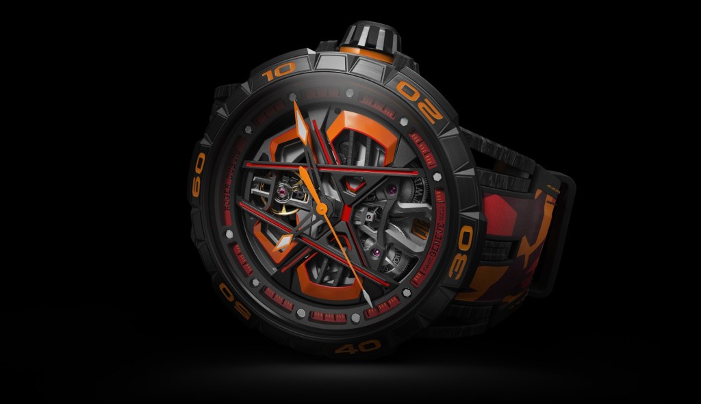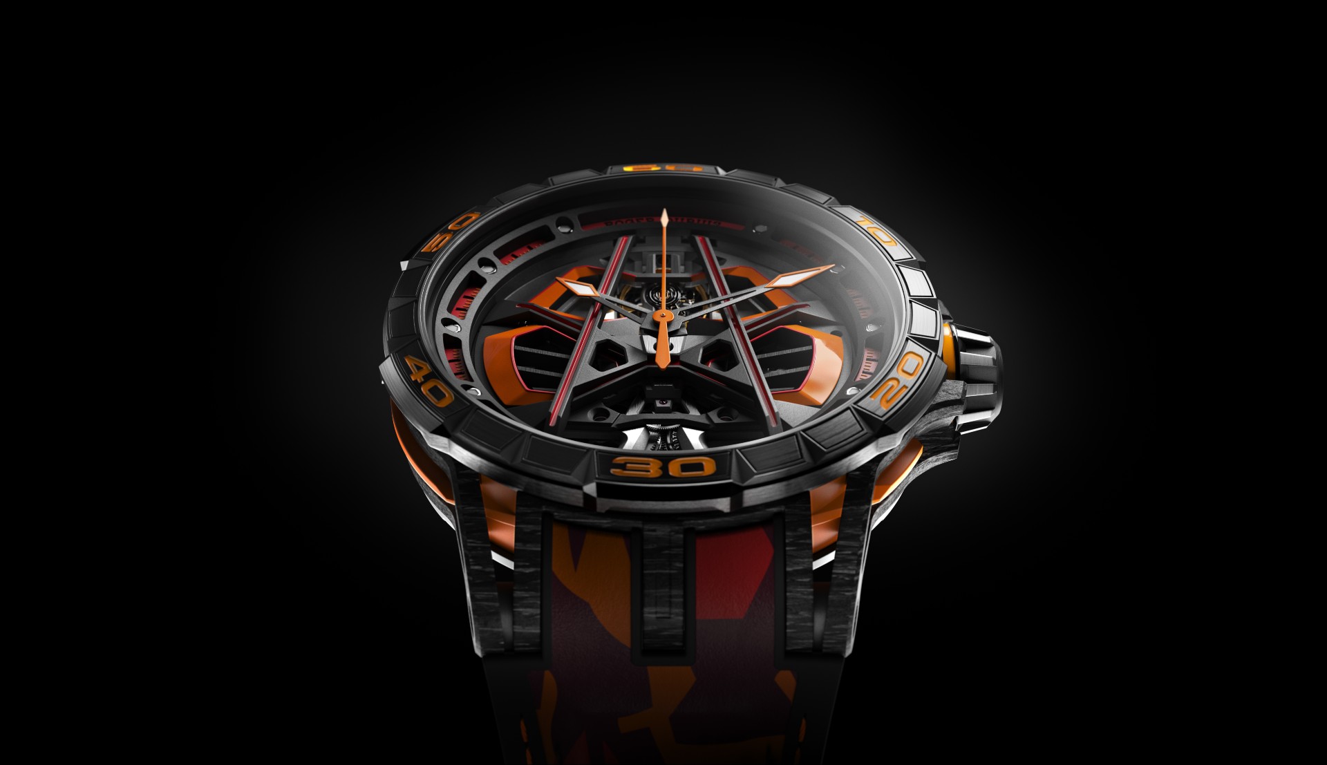 Vestido de un naranja electrizante y un rojo llamativo, el reloj es una sorprendente demostración de una estética superelegante. Las líneas afiladas que se exhiben en la esfera de las 12 a las 7 horas y de las 12 a las 5 horas recuerdan a las de la parrilla de techo del Sterrato. Un rasgo distintivo de cualquier Excalibur Spider Huracán es su corona: inspirada en las tuercas de los rines, aporta un estilo aún más contundente a la muñeca.