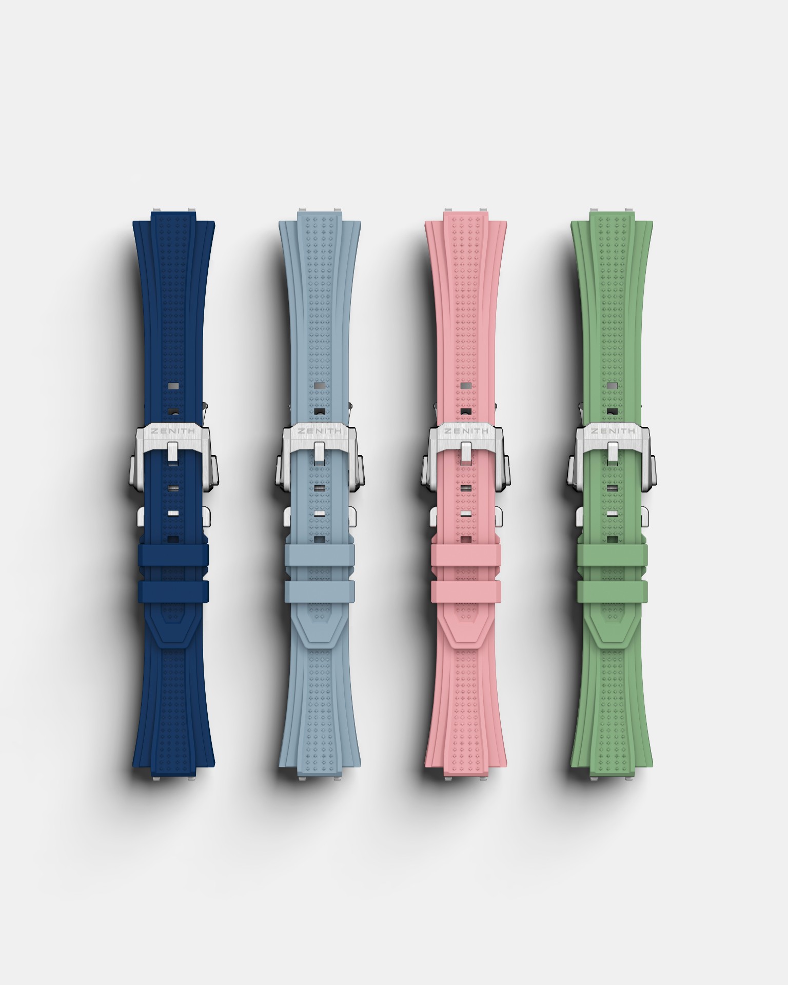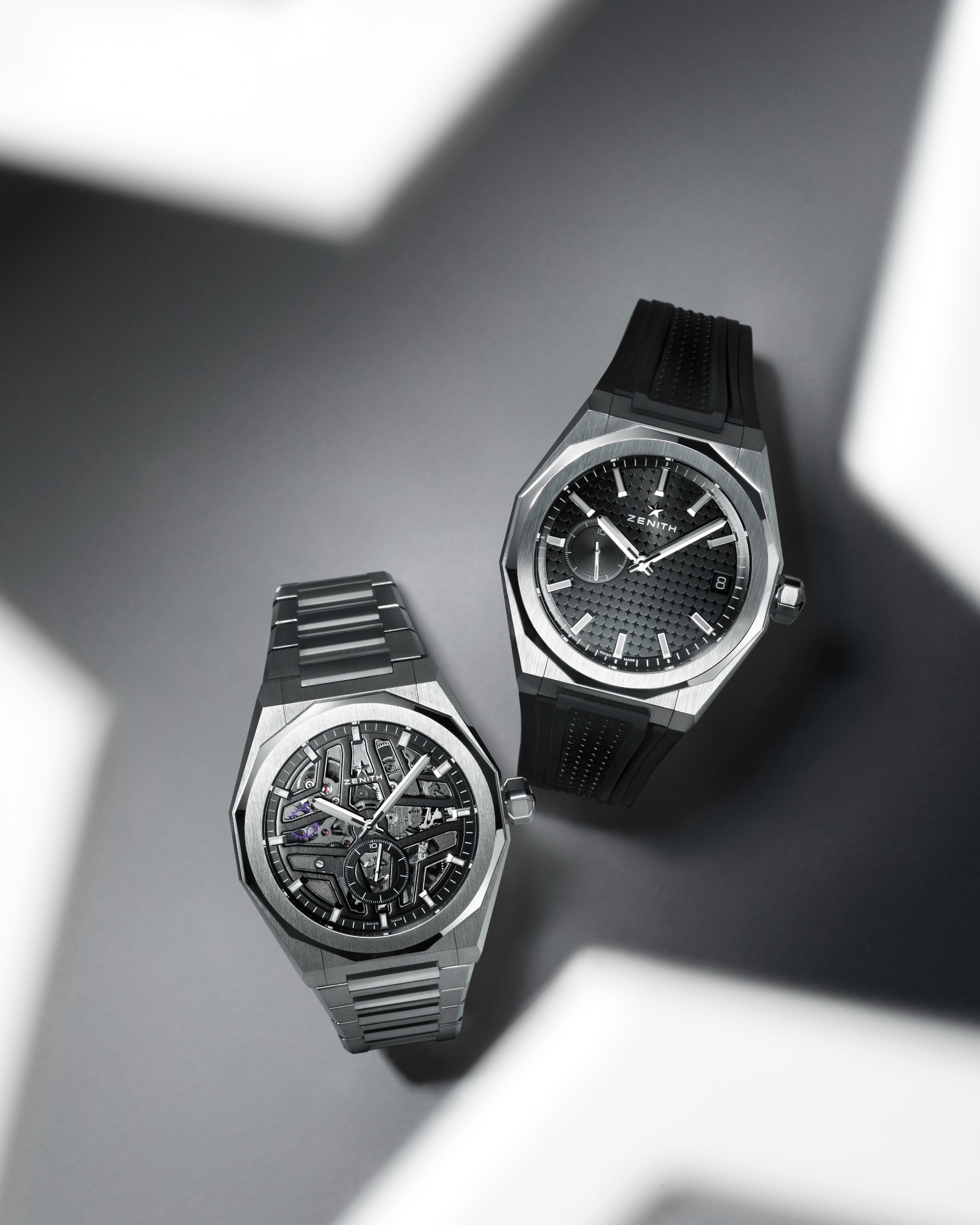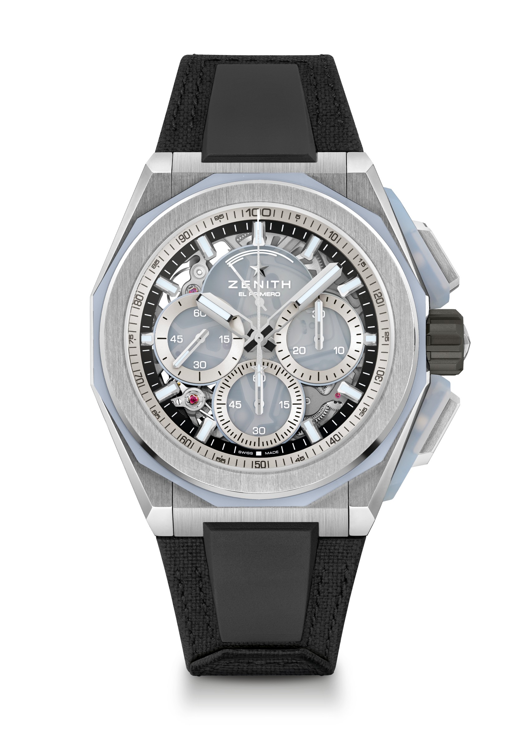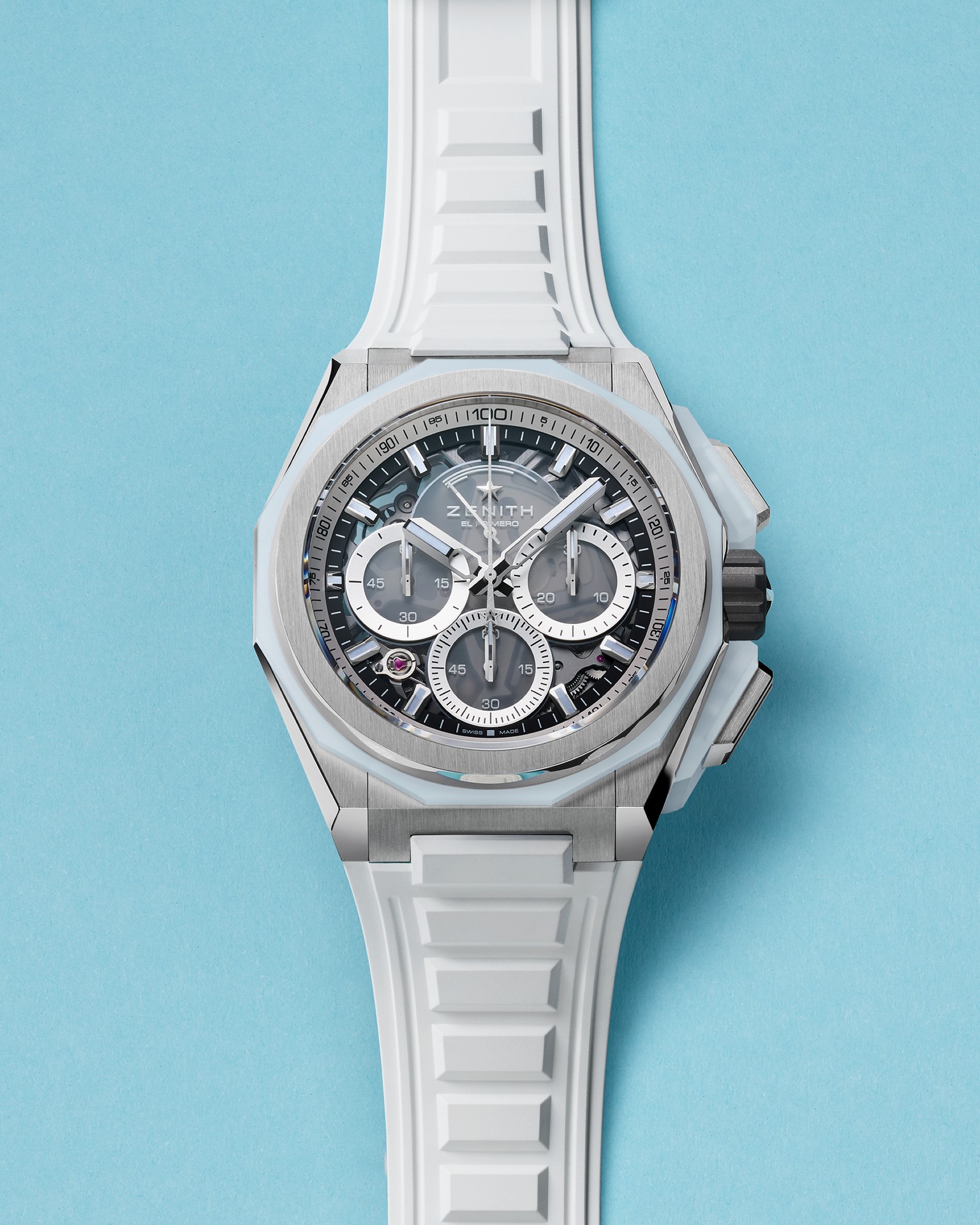 El motivo geométrico está formado por estrellas de cuatro puntas grabadas, que son una reinterpretación moderna del logotipo de la «doble Z» de Zenith de la década de 1960. Para añadir más profundidad arquitectónica, el anillo de las horas elevado e inclinado adopta la misma forma dodecagonal que el bisel. Las ruedas de la fecha, perfectamente integradas, están realizadas en colores a juego con las esferas.
