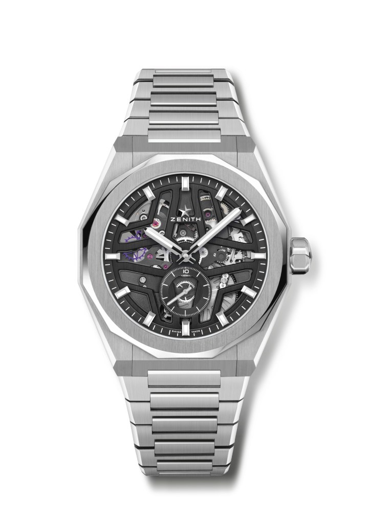 La esfera esqueleto, que se alberga en una caja angular de acero 41 mm, adopta, con una armoniosa simetría, la forma de una estrella de cuatro puntas en un guiño al logotipo de la «doble Z» de Zenith de la década de 1960. Los índices de tipo bastón aplicados en el anillo de las horas, así como las agujas centrales de horas y minutos, están rellenos de Super-LumiNova para facilitar la legibilidad, una característica poco común en los relojes esqueleto.