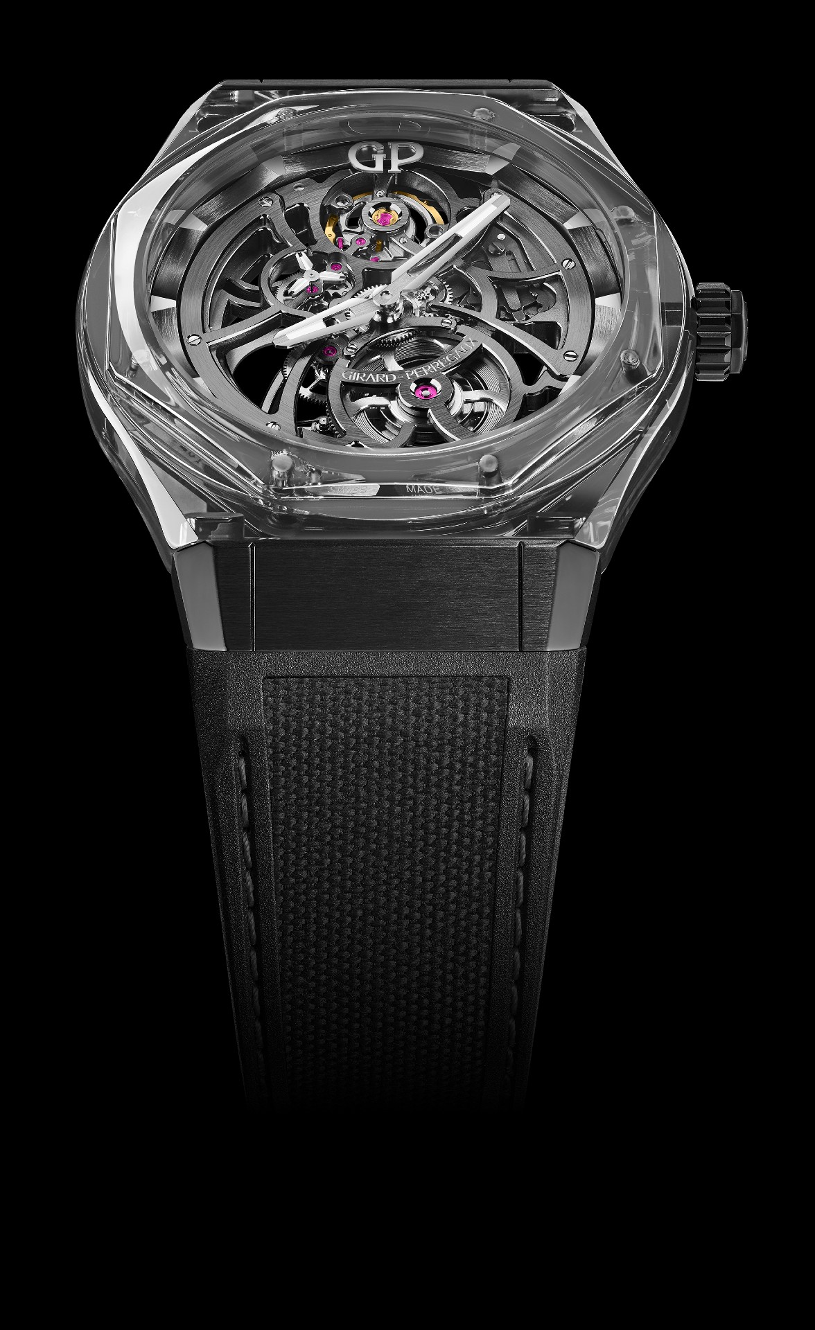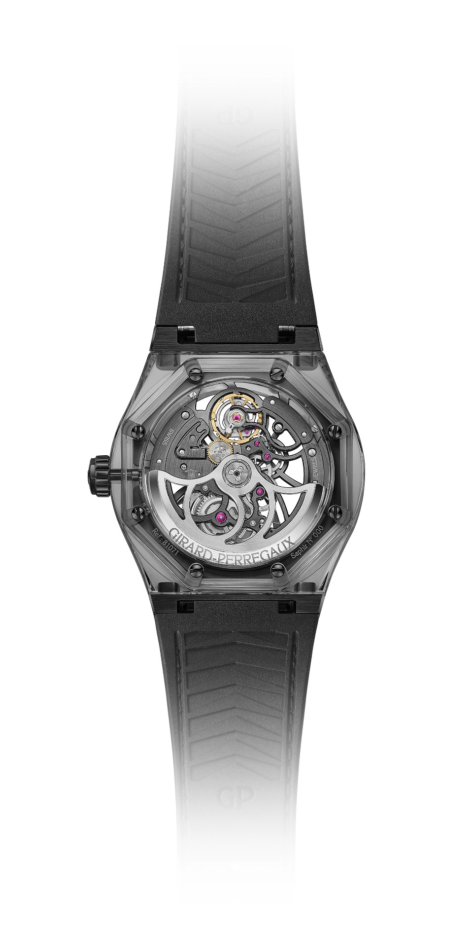 La platina del movimiento de manufactura, el calibre GP01800-1143, tiene forma octogonal, un guiño al famoso bisel de los Laureato. Su movimiento esqueletizado muestra una gran gama de piezas normalmente ocultas a la vista, lo que ofrece una fascinante perspectiva de líneas curvas y rectas, realzada por las luces y las sombras que traspasan la caja.