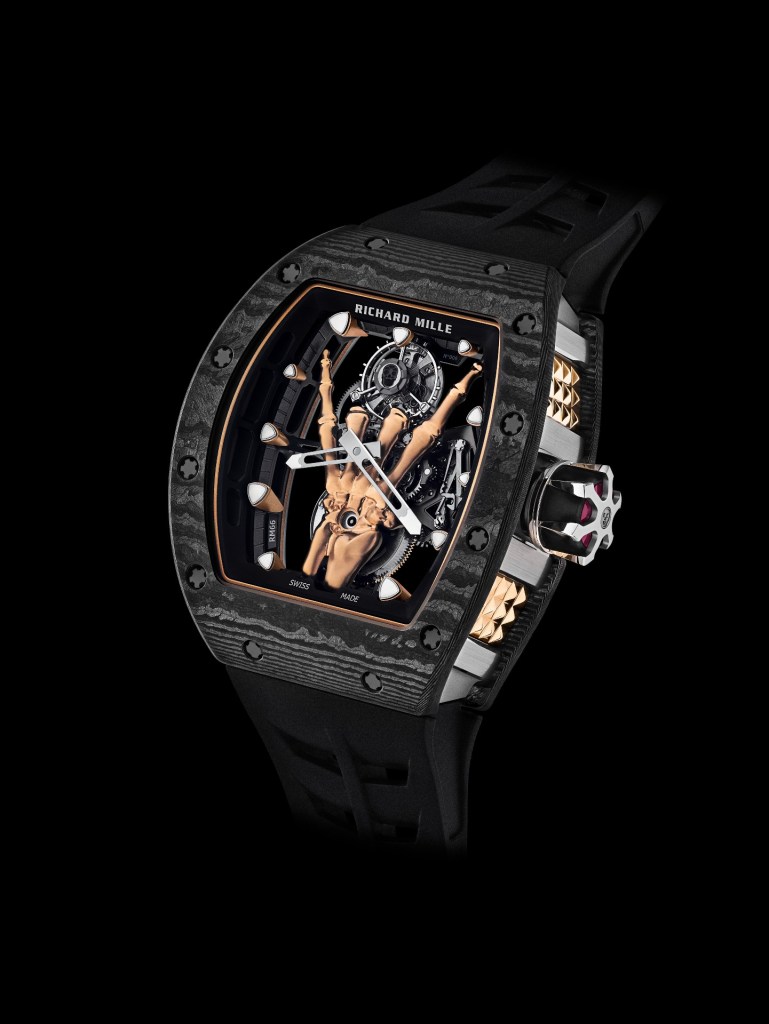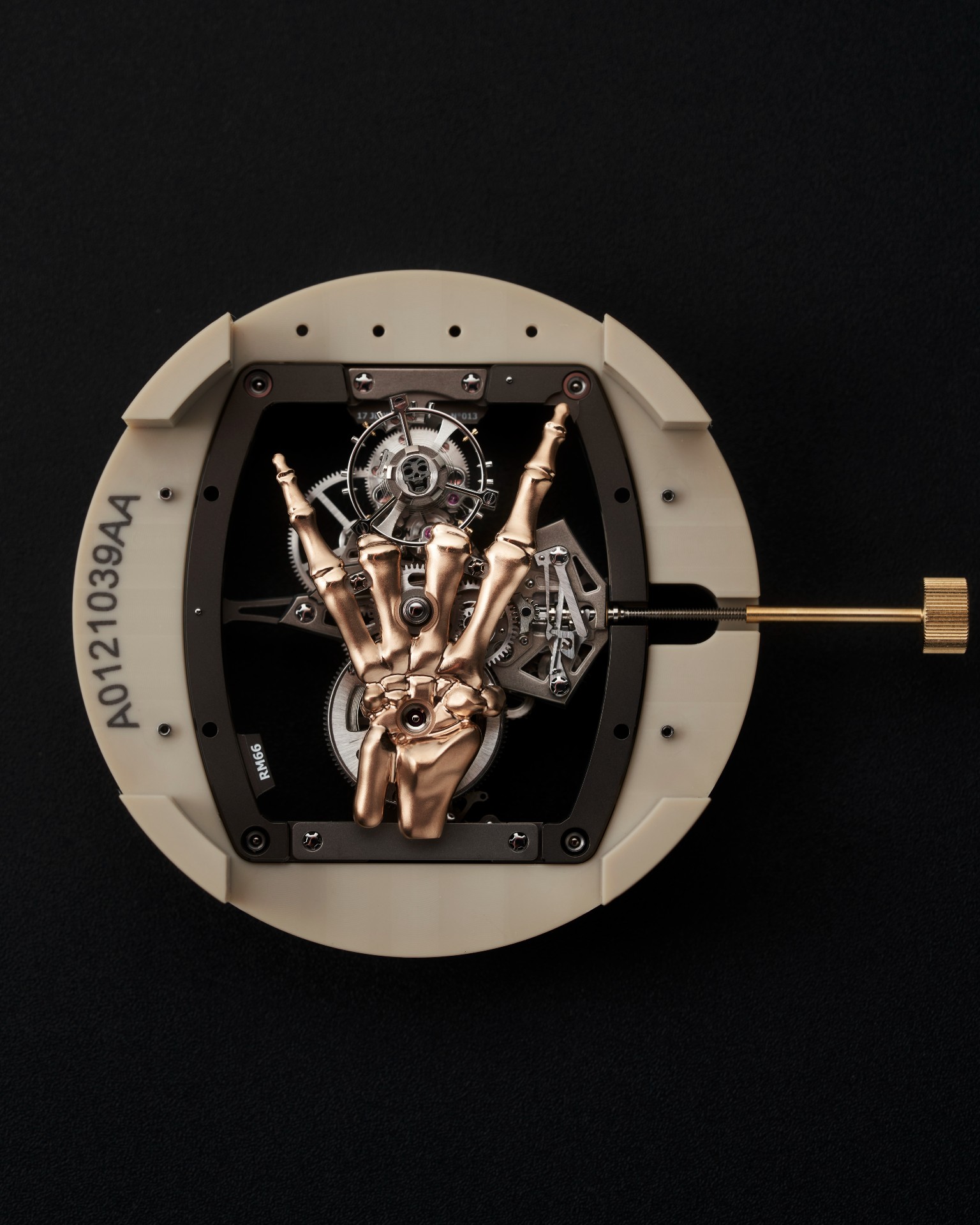 Lo primero que llama la atención es la mano calada de oro rojo 5N que sostiene el movimiento entre sus dedos. Y como Richard Mille no obedece más reglas estilísticas que las suyas propias, la mano que aparece en esta creación se ve como a través de una radiografía —un guiño al RM 052 Tourbillon Skull, cuya identidad estaba anclada en el memento mori, un recordatorio, a través del simbolismo de la calavera, de lo importante que es vivir cada momento al máximo—.