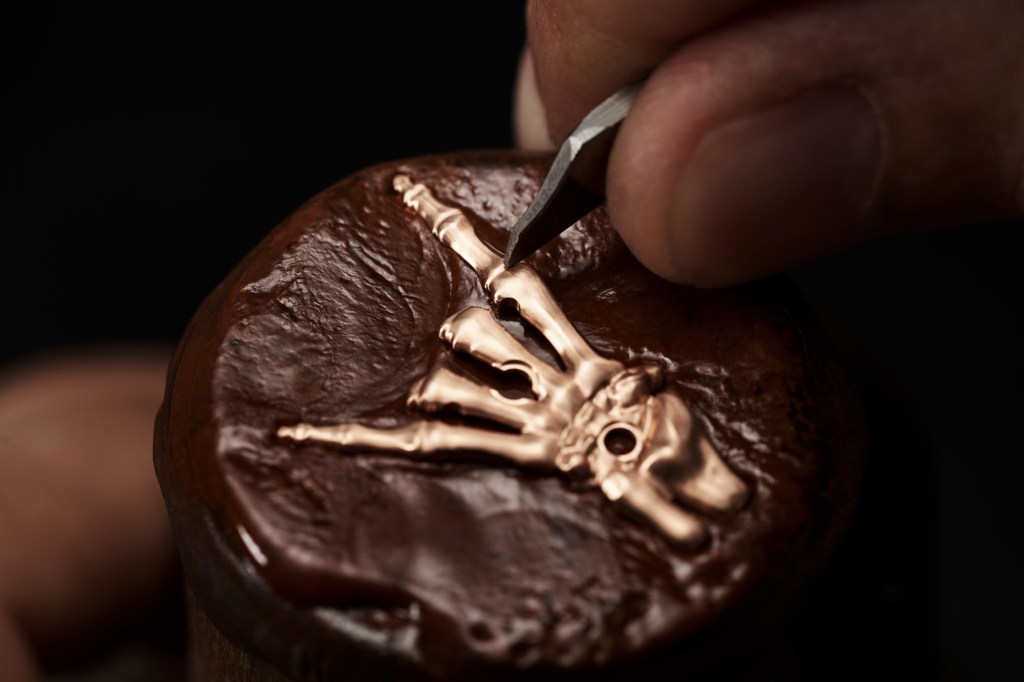 Para este modelo, concebido por la Directora Creativa y de Desarrollo, Cécile Guenat, primero se fresaron los cinco dígitos de la mano y luego se transfirieron al maestro grabador para que los perfeccionara a mano. La tarea artesanal se confió al grabador ginebrino Olivier Vaucher. El prolongado y meticuloso trabajo de desbarbado y pulido resalta los contornos de los huesos y destaca las delicadas articulaciones con su acabado microgranallado.