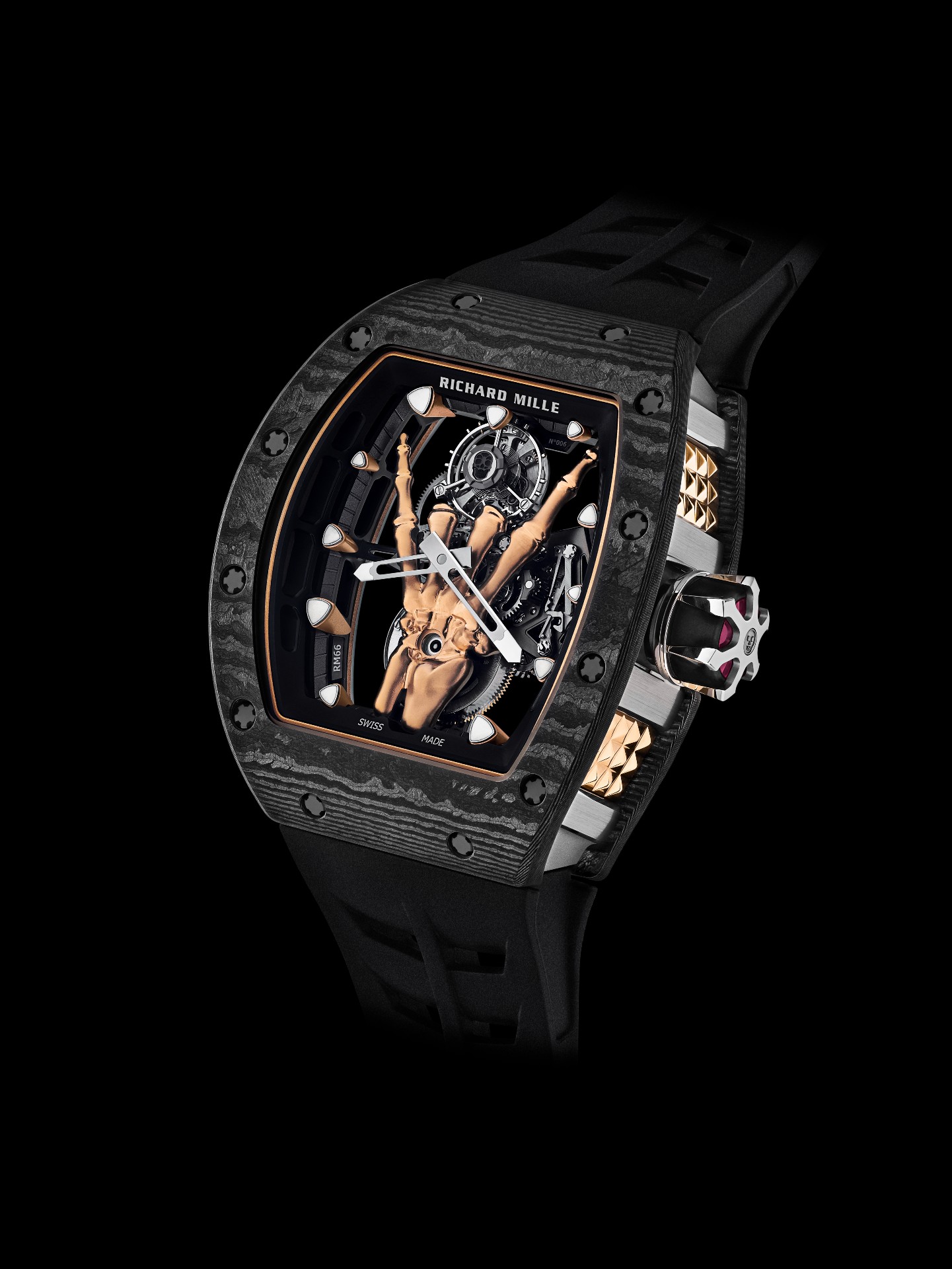 El montaje de este mecanismo fue todo un reto. La calavera grabada ofrece un guiño adicional al RM 052 Tourbillon Skull. La corona limitadora de par se desengrana automáticamente cuando la tensión del barrilete es óptima, eliminando cualquier riesgo de exceso de cuerda.