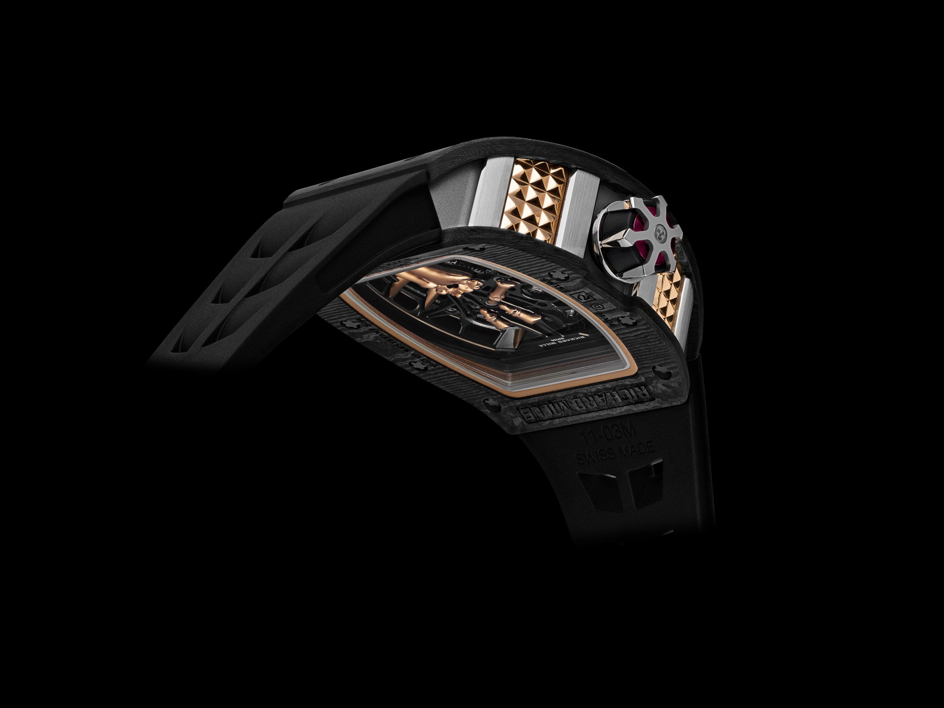 La caja juega con el contraste entre la aparente rugosidad del Carbon TPT® y el precioso brillo del oro. En la caja de titanio de grado 5, con pilares satinados y biseles pulidos, se insertan placas de oro rojo 5N. Estas placas presentan un motivo ‘clous de Paris’, rectificado tras el mecanizado y, a continuación, pulido a mano para restaurar los bordes afilados característicos de las correas punk.