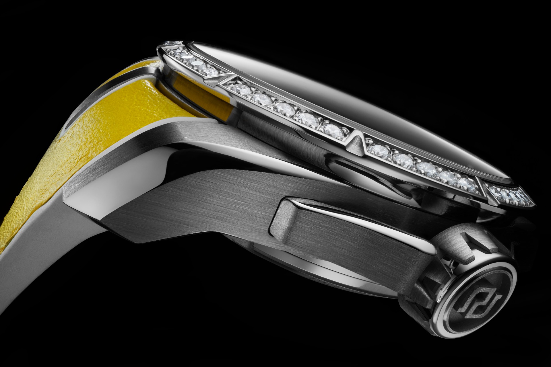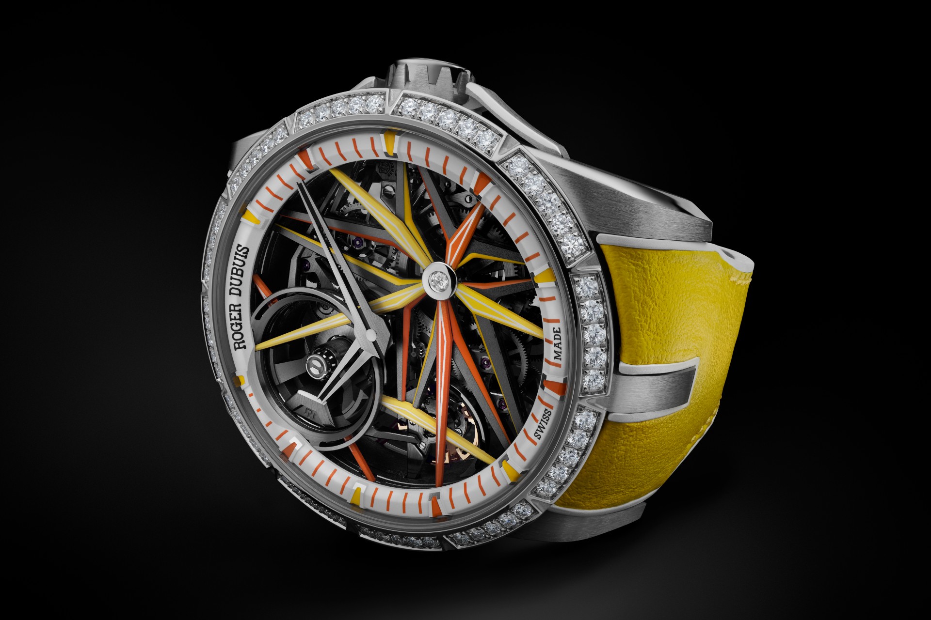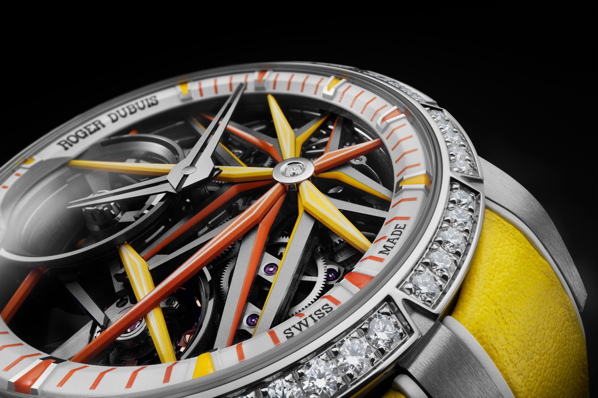 Dentro de esta colección cápsula se encuentra un reloj vestido de amarillo claro y realzado con vibrantes toques naranja, que aportan un equilibrio armónico al diseño, rompiendo el efecto monótono y creando un camafeo. Estos tonos tan vivos también contribuyen a crear su estética característica, dejando que los detalles del expresivo calibre salgan a la luz capa a capa.