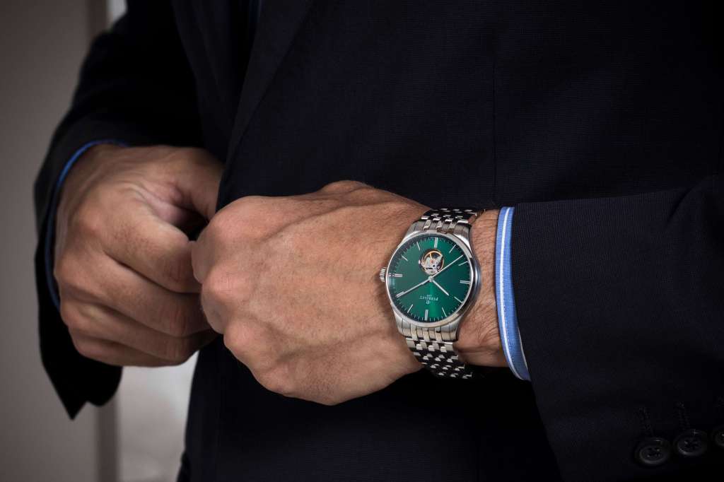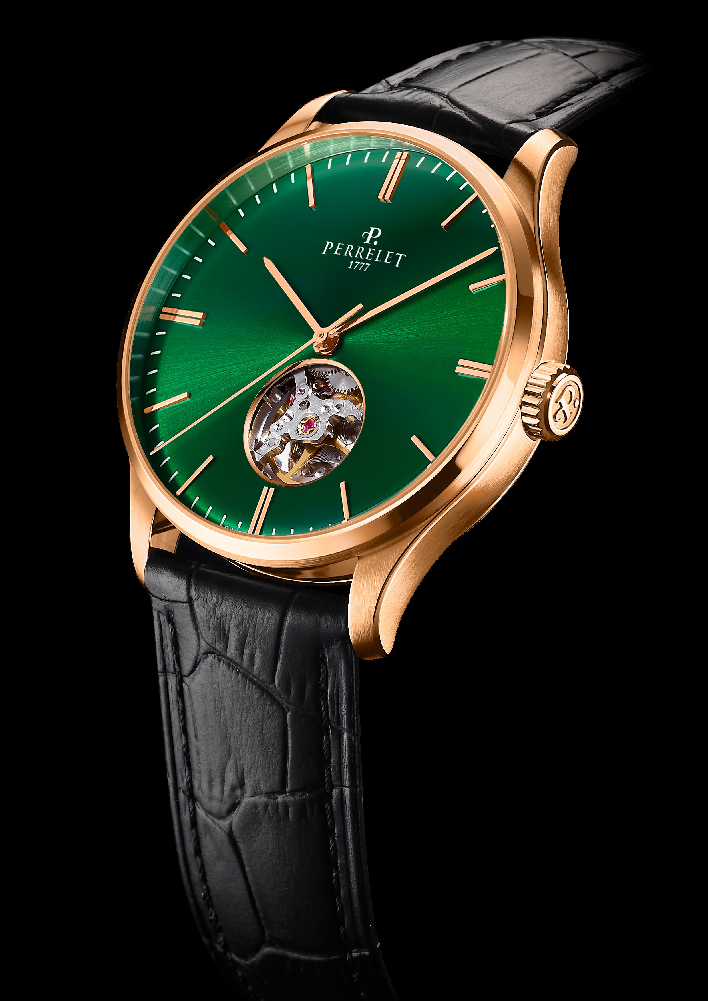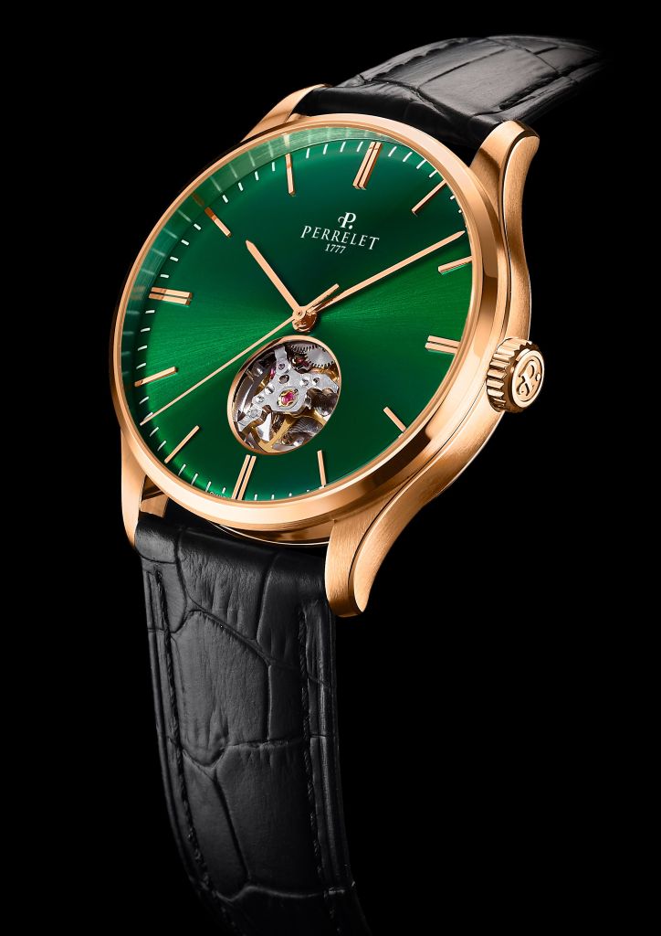 Las tres versiones se completan con una correa de piel de becerro negra con motivo de aligátor y una hebilla decorada con el logotipo de Perrelet a juego con las versiones de caja. Las variantes de caja de acero también pueden combinarse con un brazalete cómodo y ergonómico compuesto por 7 eslabones por fila con acabados pulidos y cepillados alternados, lo que confiere a los relojes un aspecto más informal.