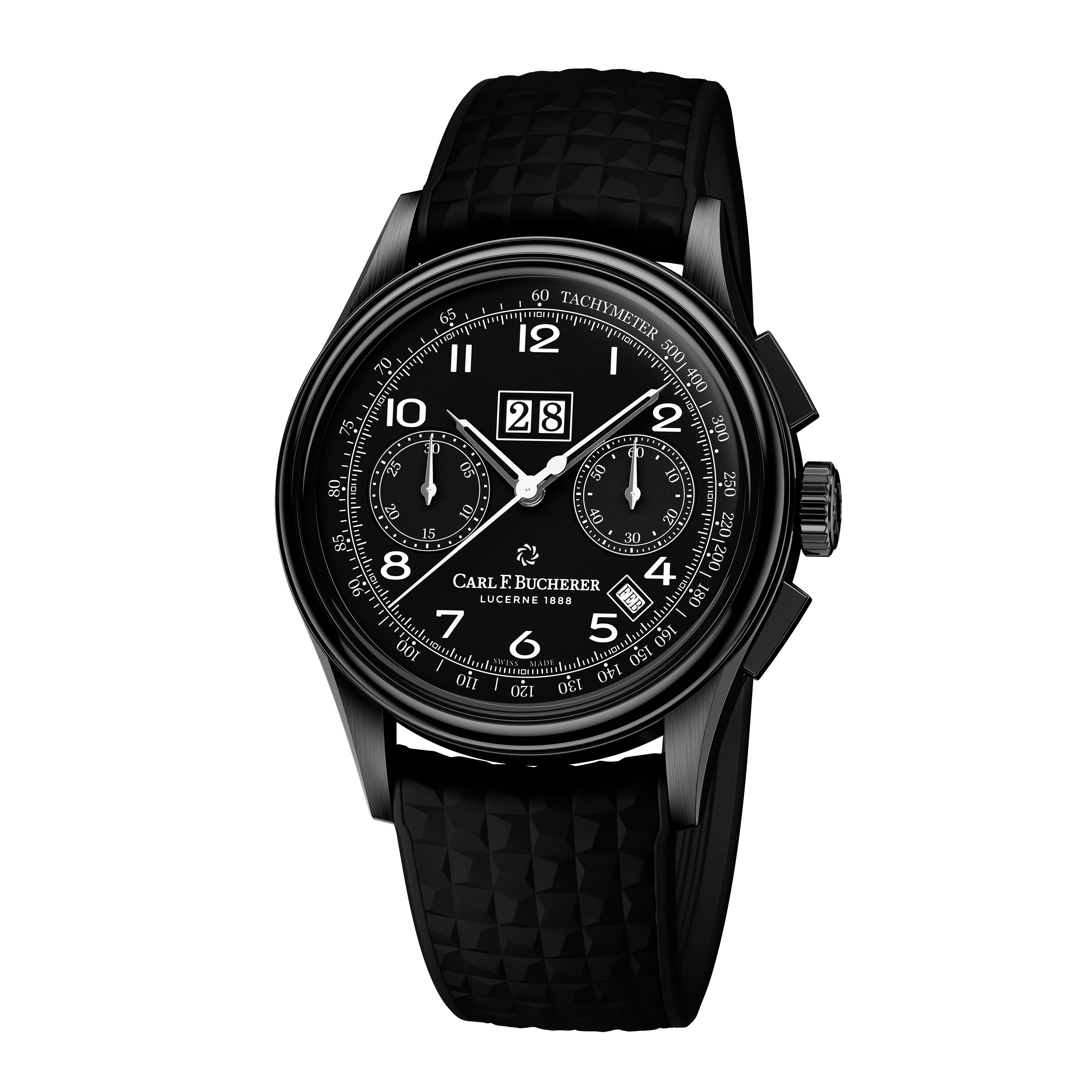 El Manero Flyback Black, ilimitado, es la expresión de la colección cápsula de uno de los relojes más populares de Carl F. Bucherer. Cuenta con una caja de acero inoxidable recubierto de DLC con superficie lacada mate de color negro intenso. El calibre CFB 1970 presenta funciones de cronógrafo y flyback.
