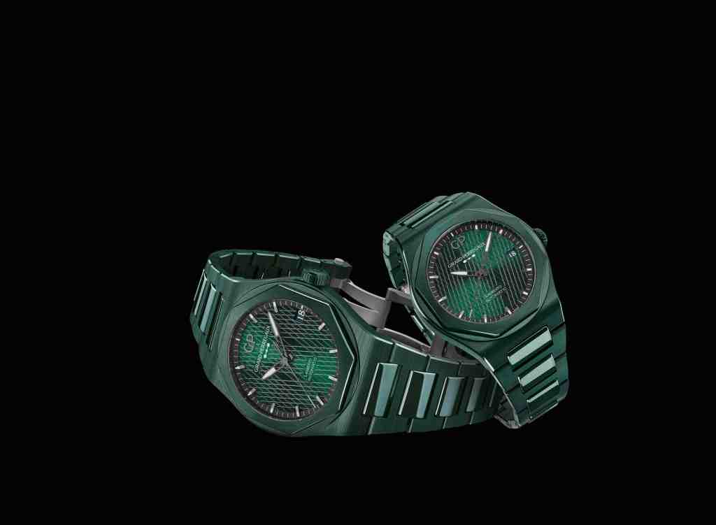 Este nuevo Laureato respeta estos elementos clásicos, pero también utiliza una cerámica ultramoderna para la caja y la pulsera. Este ligerísimo material está compuesto de óxido de circonio y otros óxidos metálicos (que otorgan al material su característico color verde).