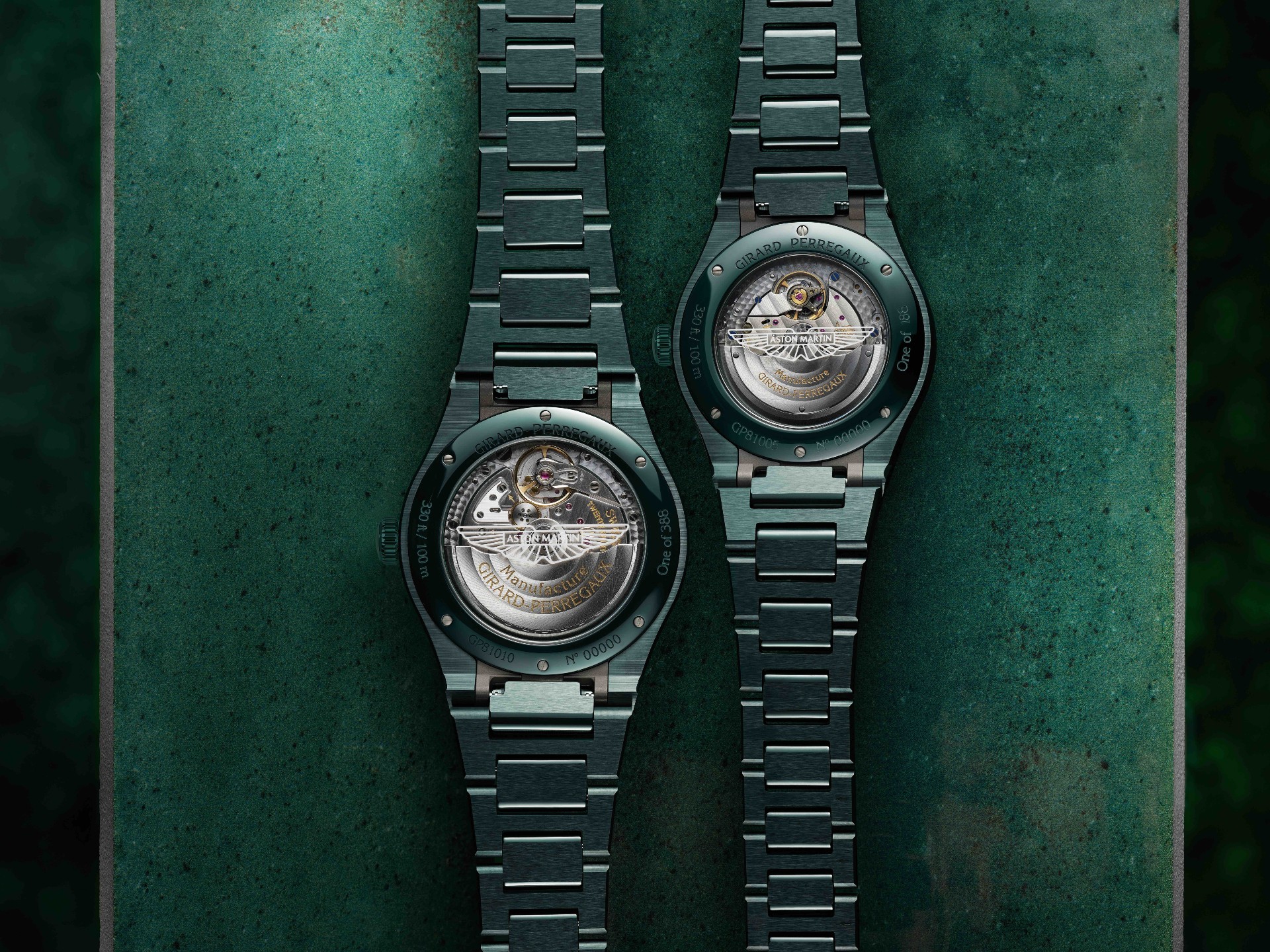 El Laureato Green Ceramic Edición «Aston Martin» (42 mm y 38 mm) se pondrá a la venta en junio de 2023 y estará disponible en todo el mundo a través de los distribuidores seleccionados de Girard-Perregaux.