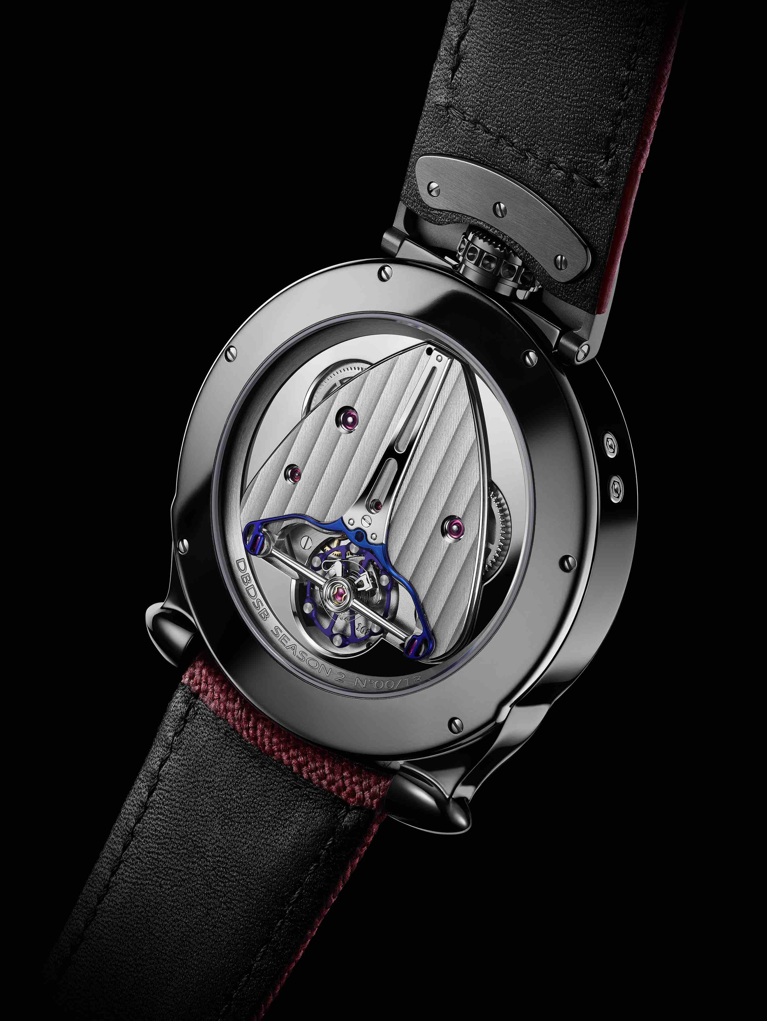 Impulsado por un calibre mecánico de cuerda manual DB2044 que funciona a una frecuencia de 28.800 alternancias por hora, el DBD «Season 2» está equipado con un volante de titanio de última generación con inserciones de oro blanco, así como con un sistema de amortiguación de triple paracaídas.