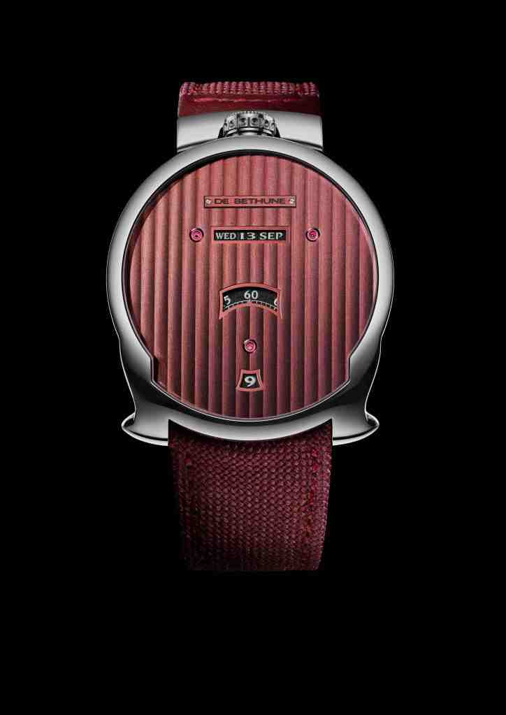 La discreta estética de este reloj deja entrever la complejidad de su creación. Con su movimiento de cuerda manual que impulsa un triple calendario en línea y una visualización digital de la hora, el primer DBD lanzado en 2006 ofrecía una interpretación totalmente diferente del reloj y se convirtió en un hito de la industria del que De Bethune produjo 39 modelos de oro rosa o blanco.