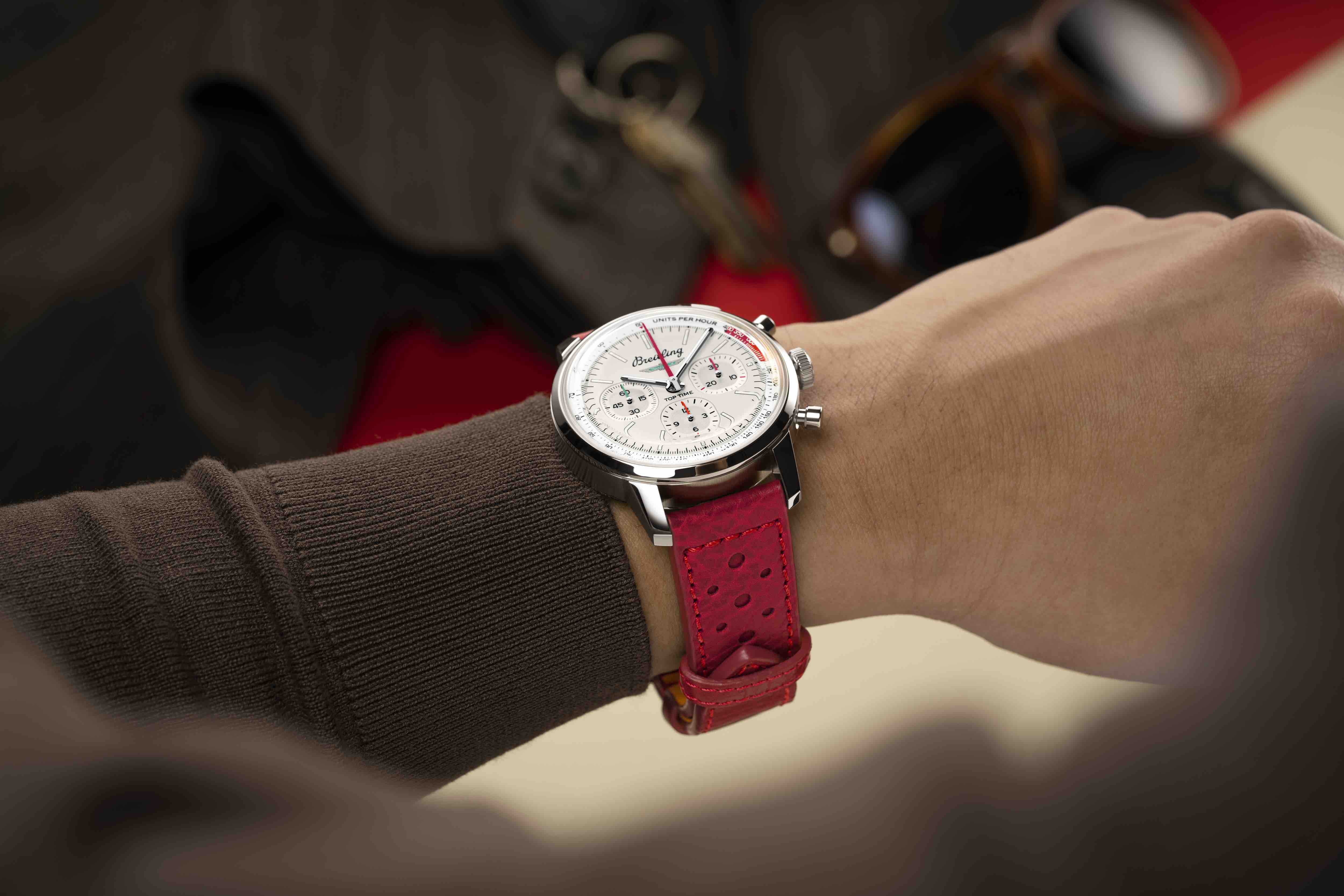 Los elementos de diseño incluyen la correa de carreras hecha en piel perforada, la escala de taquímetro para medir la velocidad y esferas internas con una forma intermedia entre un cuadrado y un círculo que recuerdan los indicadores del salpicadero de la época.
