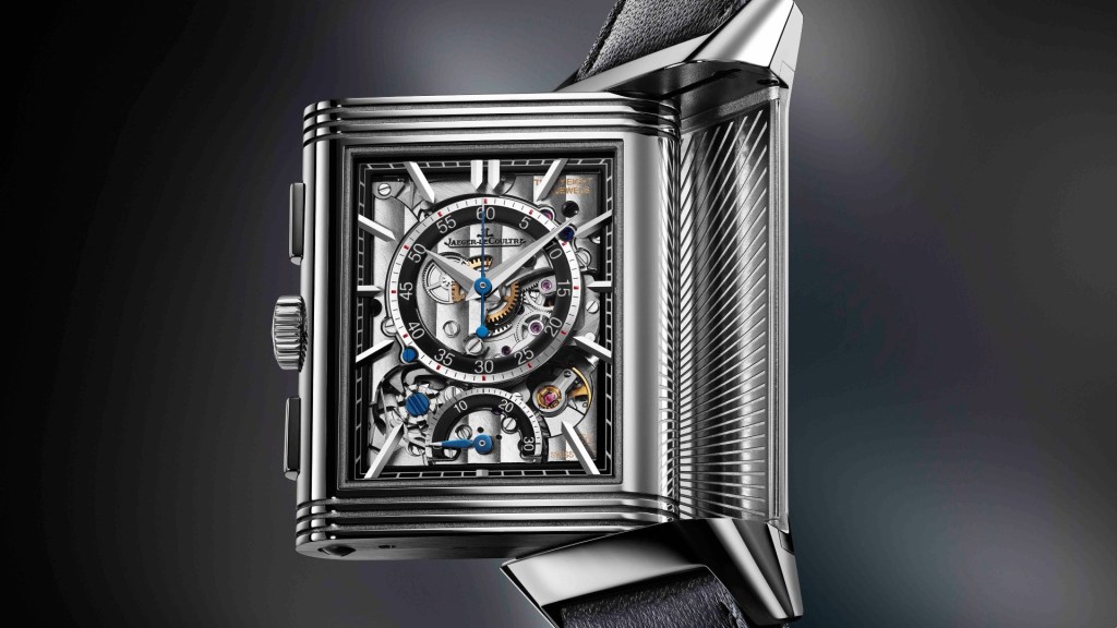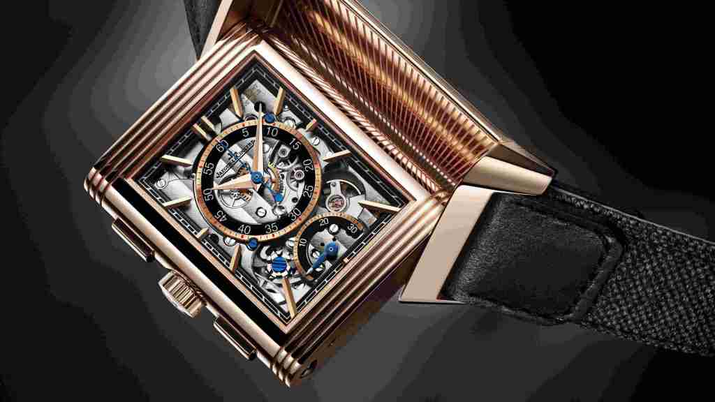Para indicar las horas y los minutos tanto en la esfera delantera como en la trasera, el movimiento acciona dos juegos de agujas que deben moverse en direcciones opuestas para indicar la hora correctamente en ambos sentidos. A pesar de la complejidad del cronógrafo retrógrado, que combina dos indicaciones horarias y tiene no menos de 300 componentes, el movimiento rectangular respeta la filosofía de elegancia de Jaeger-LeCoultre y cabe en una caja de menos de 10 mm de grosor.