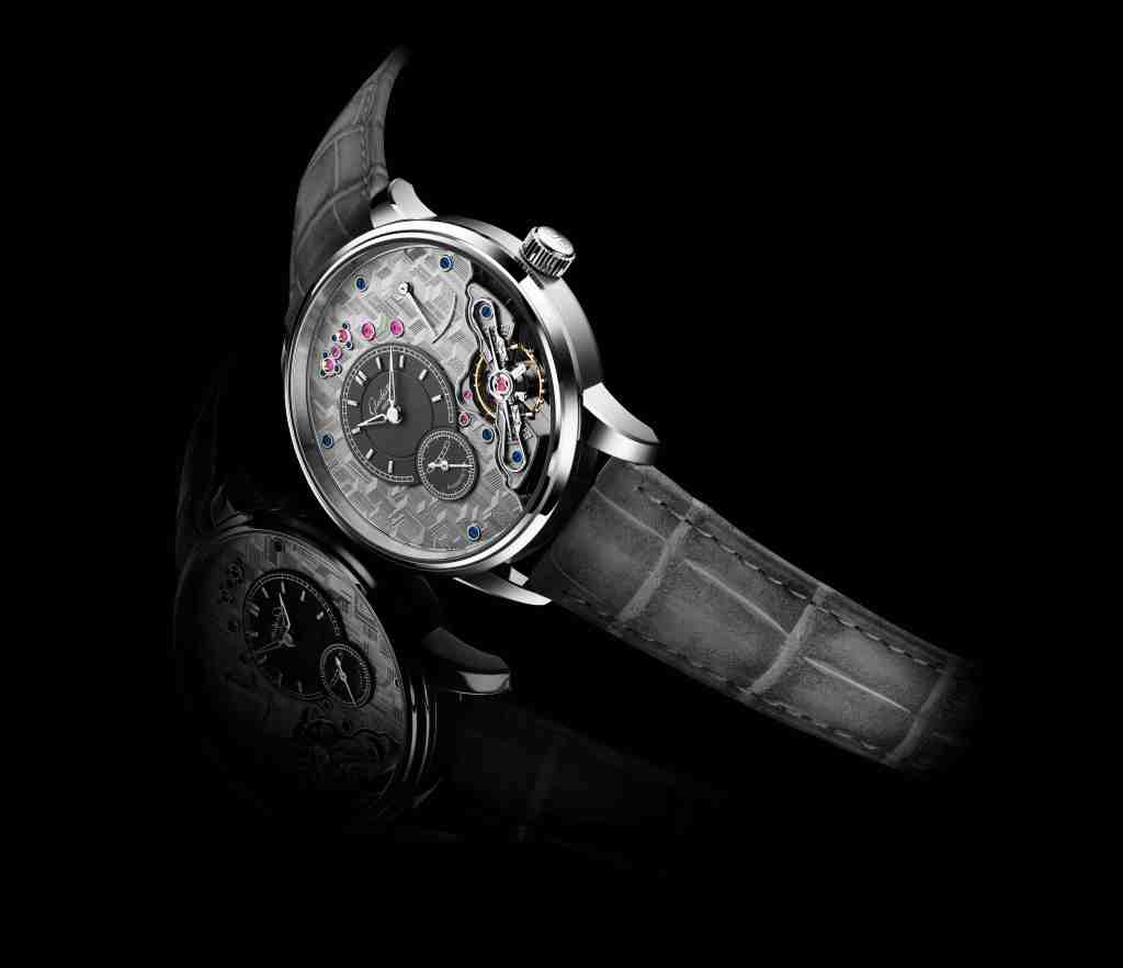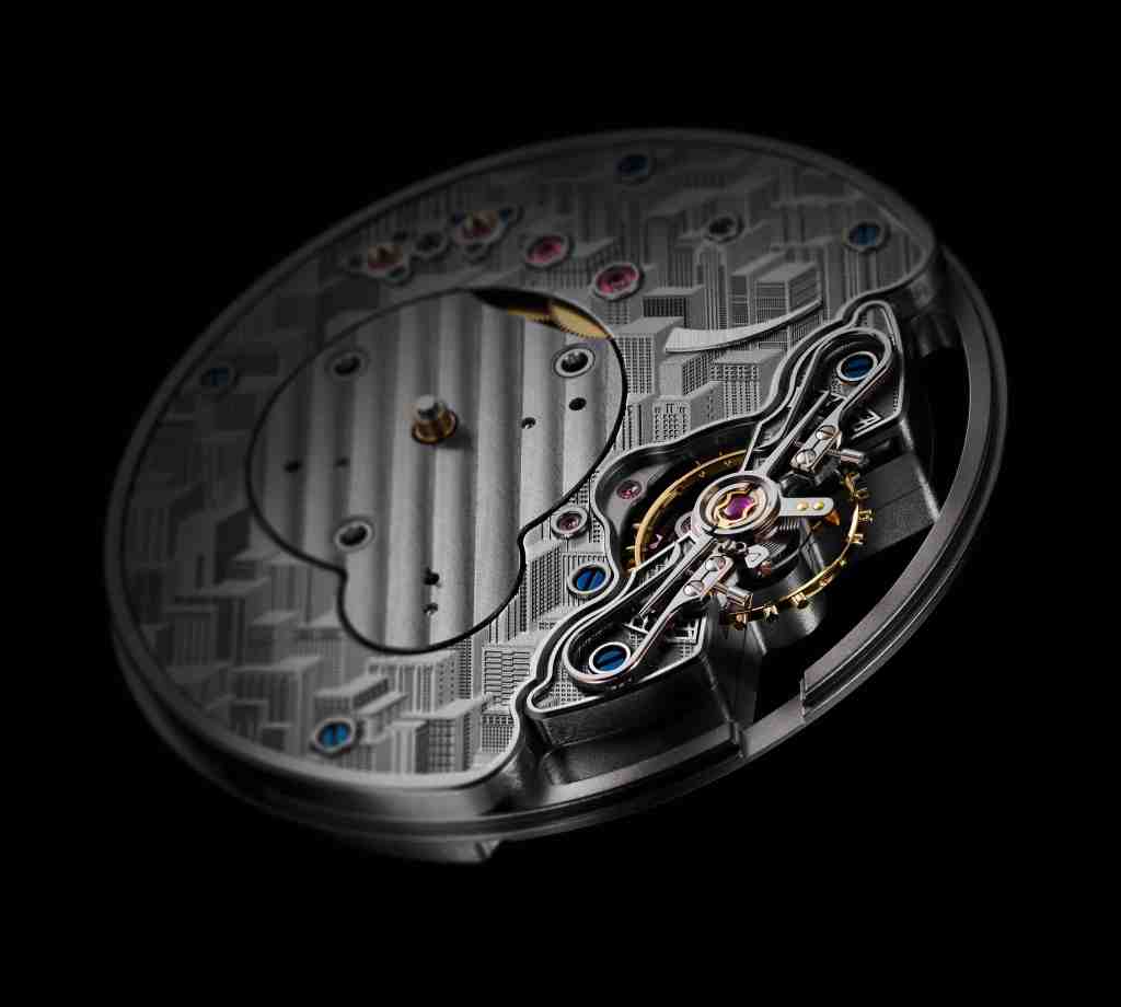 Y una refinada silueta de rodio negro galvánico, grabada con láser, recorre la platina de tres cuartos y el puente de mariposa, reapareciendo en el fondo del reloj. Los cristales de zafiro transparentes del reloj y el movimiento parcialmente esqueletado atraen la atención hacia la muñeca del usuario, convirtiéndola en parte de la historia del reloj.