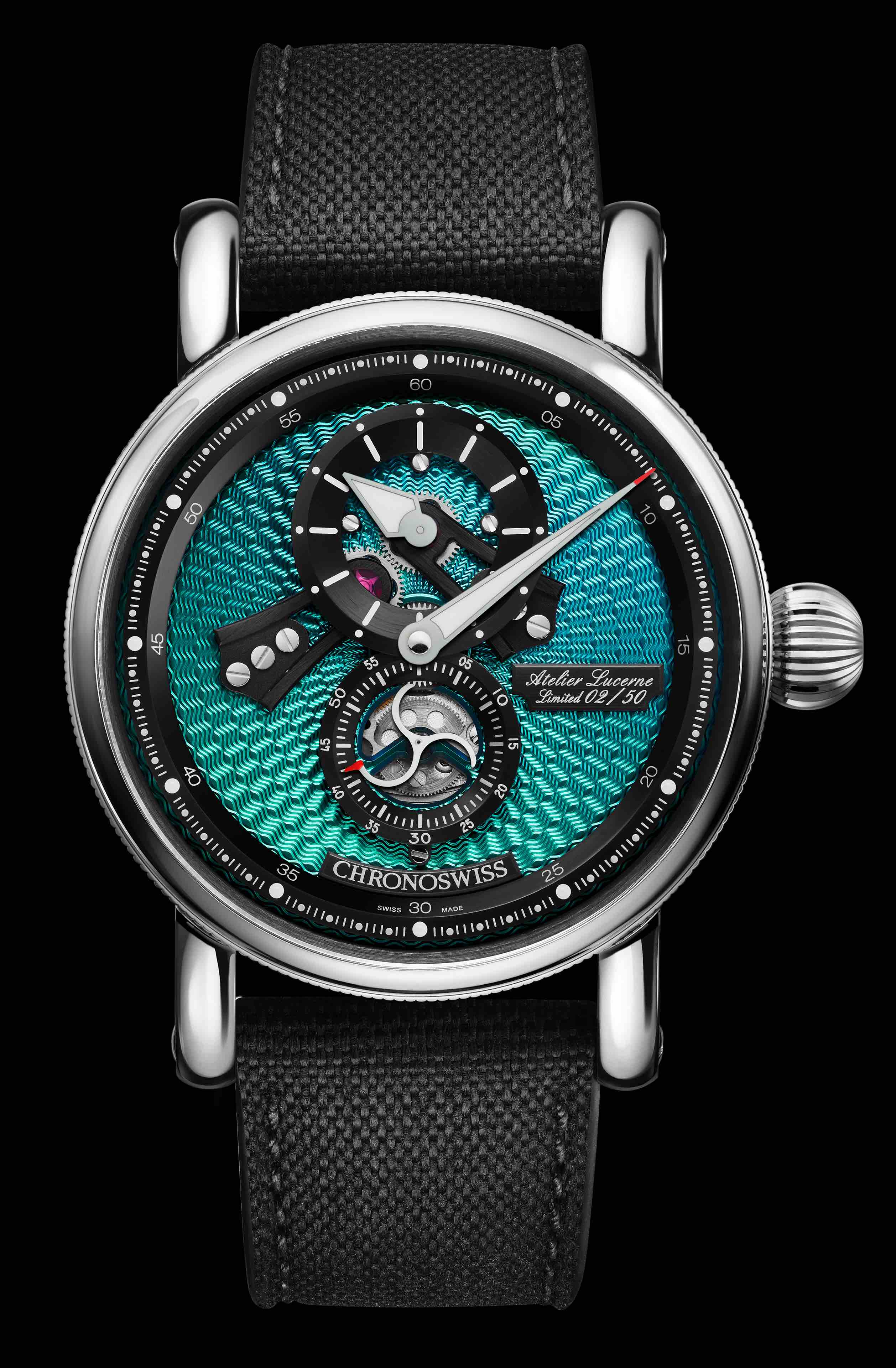 El efecto de cambio de color es el resultado de incansables experimentos en un campo en el que Chronoswiss es líder: Los revestimientos CVD sobre esferas grabadas a mano. La esfera, que en realidad forma parte del movimiento, brilla como una piedra preciosa y se fabrica íntegramente en el Atelier Lucerne, donde cada esfera se corta a mano en una máquina centenaria. El proceso es una profesión casi extinta que requiere creatividad, sumo cuidado y experiencia.