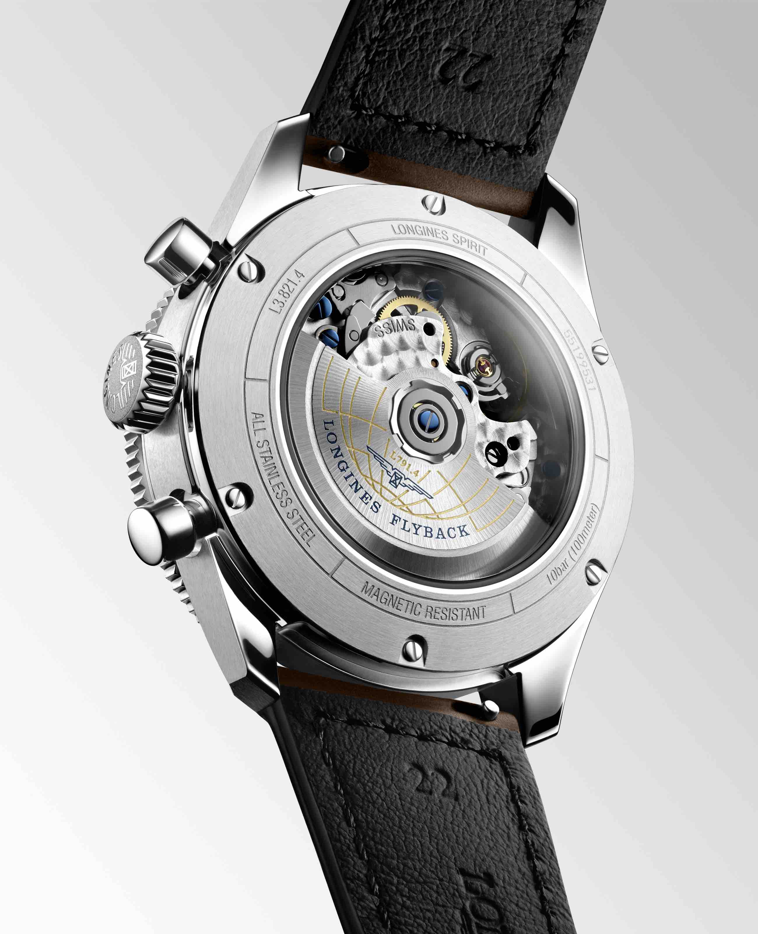 El Longines Spirit Flyback destaca por su tecnología de punta y su estética refinada. Su movimiento es extremadamente preciso, cuenta con una reserva de marcha de 68 horas y tiene el certificado de cronómetro otorgado por el COSC. Además, su fondo transparente permite ver todos los detalles del calibre, entre ellos una superficie personalizada y grabada con la rueda típica de la colección Longines Spirit y con el nombre Longines Flyback.