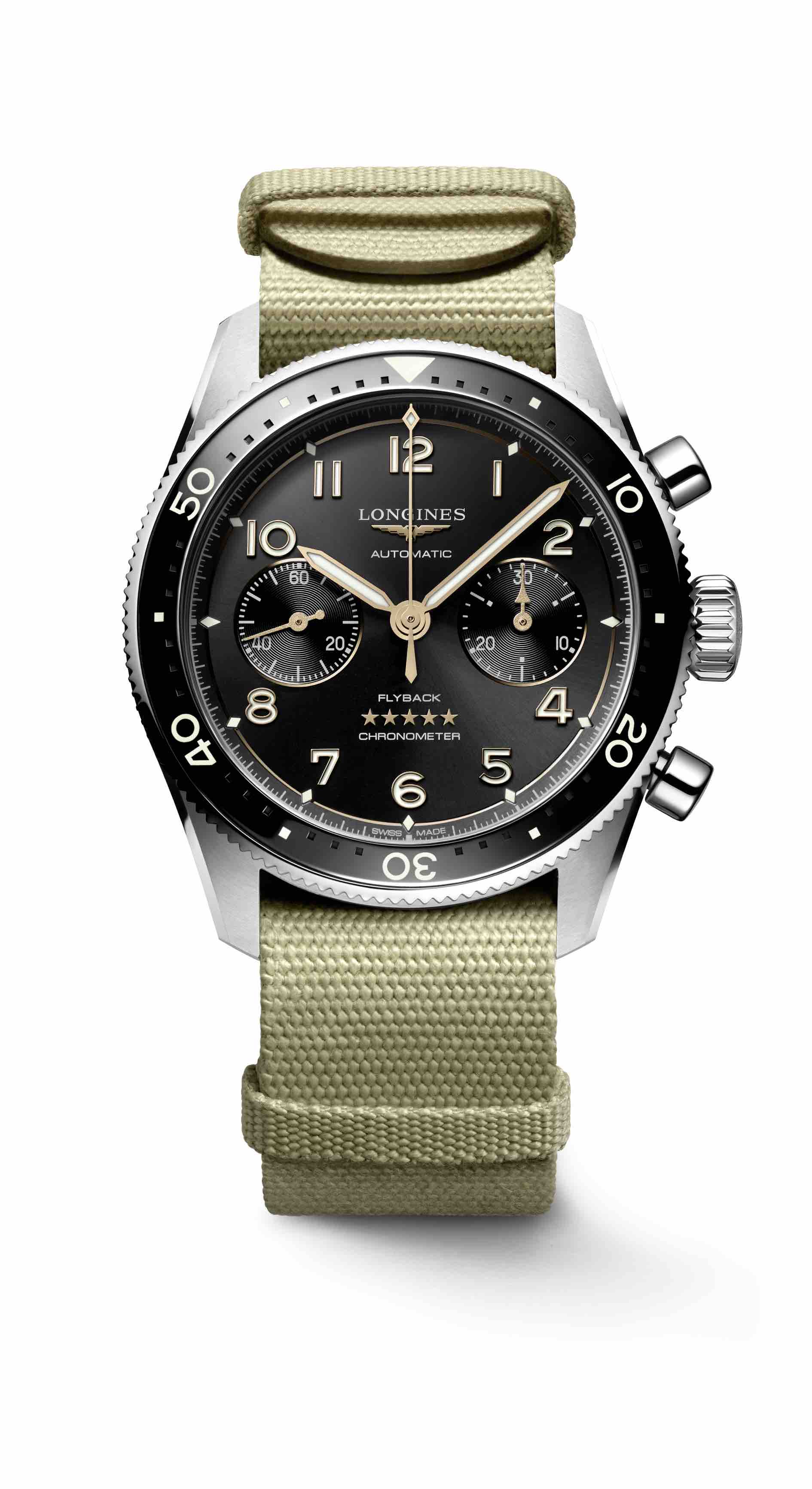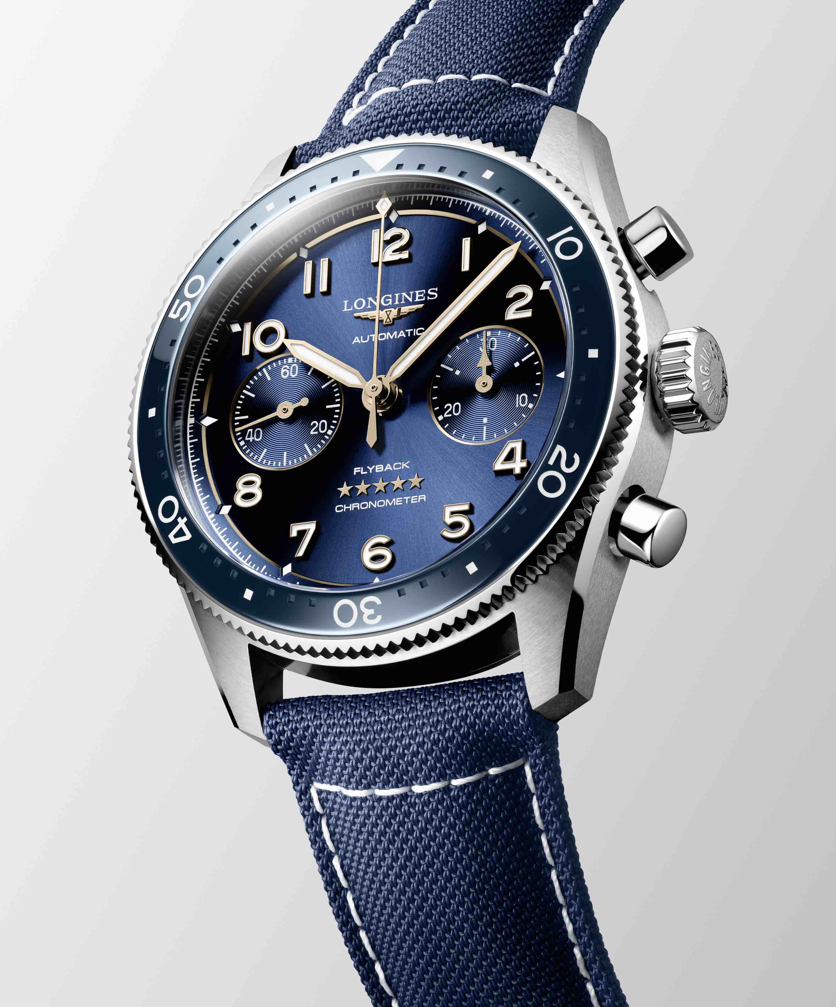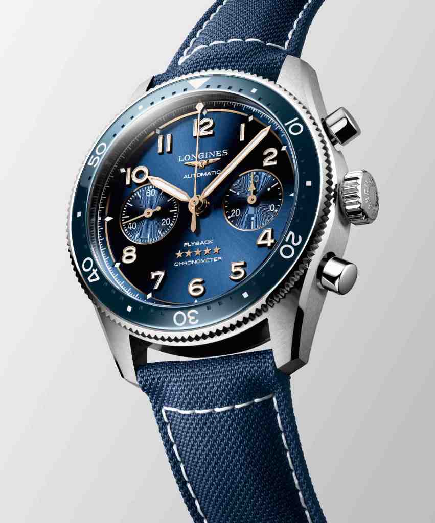 El Longines Spirit Flyback está disponible con esfera negra o azul soleado y con una caja de acero de 42 mm que se puede combinar con una pulsera de acero inoxidable intercambiable, una correa de cuero marrón o textil azul con hebilla desplegable y una correa beige tipo NATO.