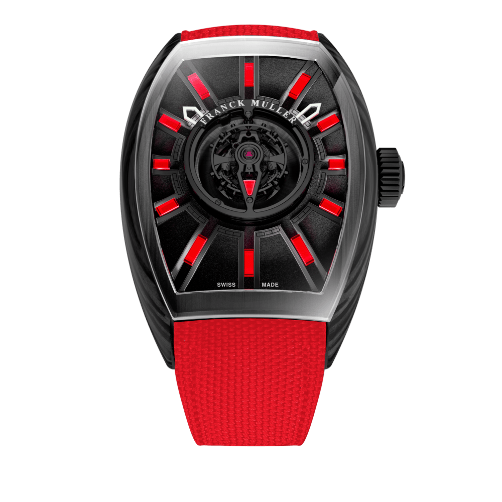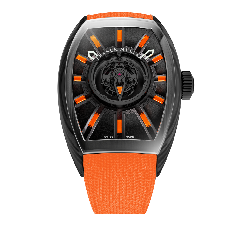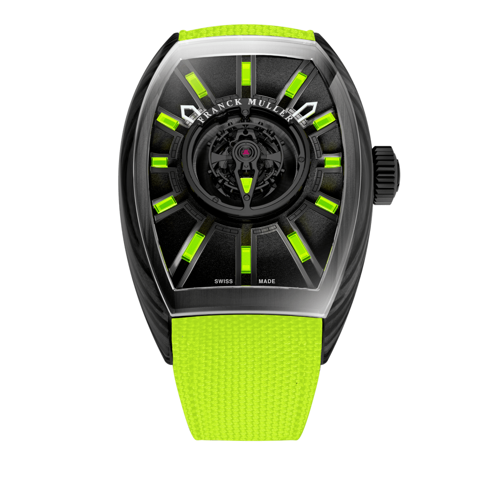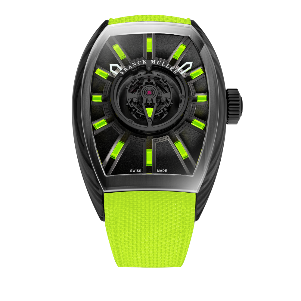 Los icónicos números de Franck Muller se reemplazaron por índices de colores brillantes, y la esfera fue tratada con un negro mate profundo para permitir la absorción de luz 😮. La interacción entre la luz y el material es impresionante y todos los elementos apuntan al centro de la esfera para sublimar la mecánica del Central Tourbillon.