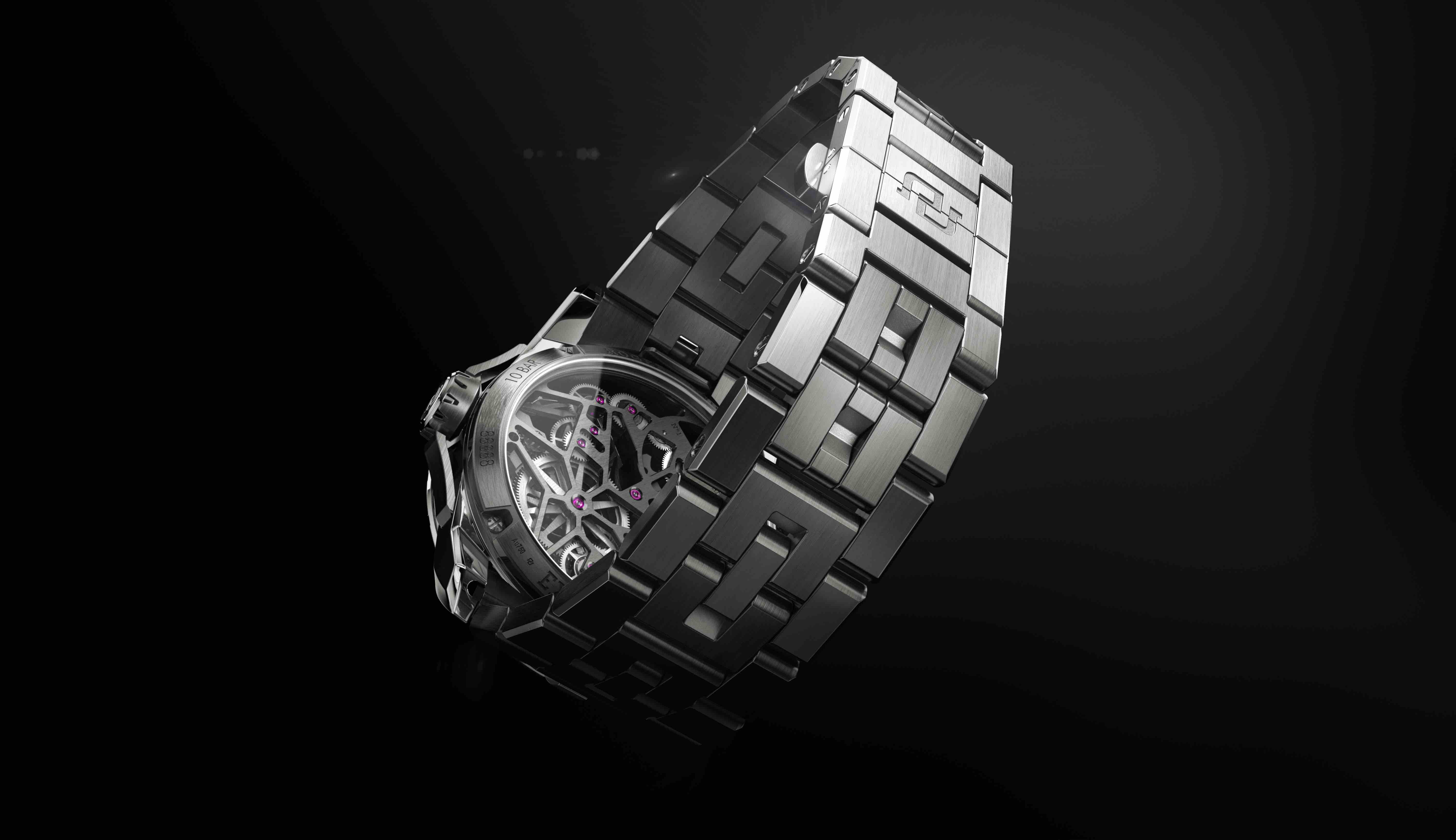 En cuanto a su diseño, el Excalibur MB Titanium es una interpretación moderna de un icono de Roger Dubuis. Está decorado con un esmalte metálico mate de calidad superior combinado con los brillantes biselados pulidos de la pulsera, creando un contraste nítido que muestra la proeza técnica constante de los relojeros.