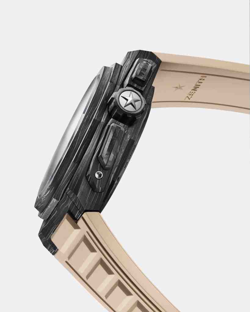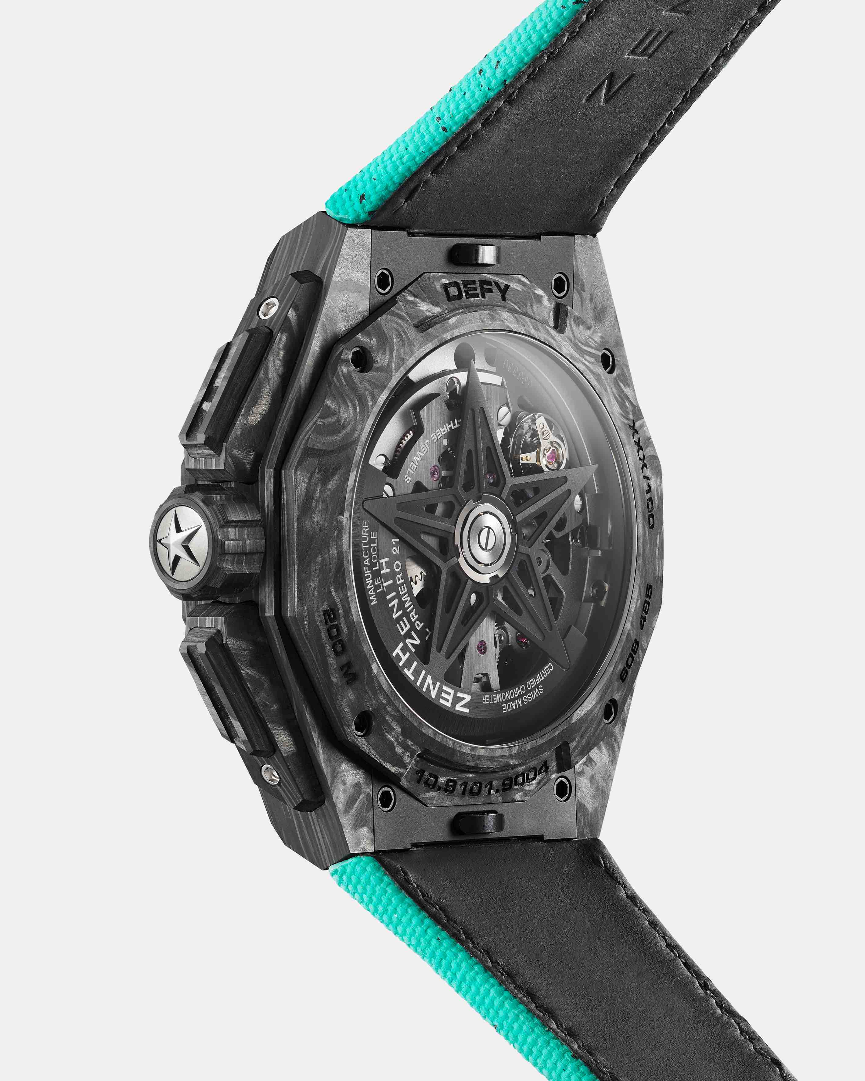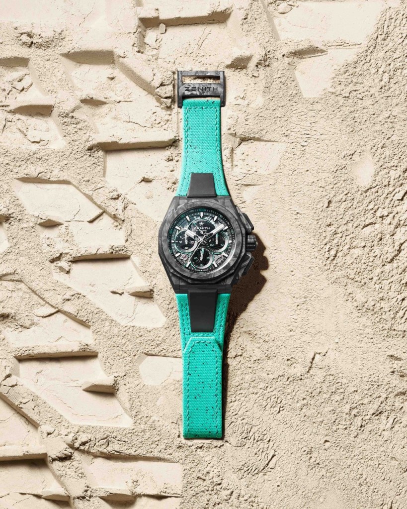 Su construcción se basa en materiales de alto rendimiento y cuenta con un movimiento de cronógrafo de alta frecuencia que mide el tiempo con la máxima precisión. Este reloj encarna los valores de sostenibilidad compartidos por Extreme E y la iniciativa HORIZ-ON de ZENITH, utilizando partes recicladas de las carreras en su correa y embalaje.