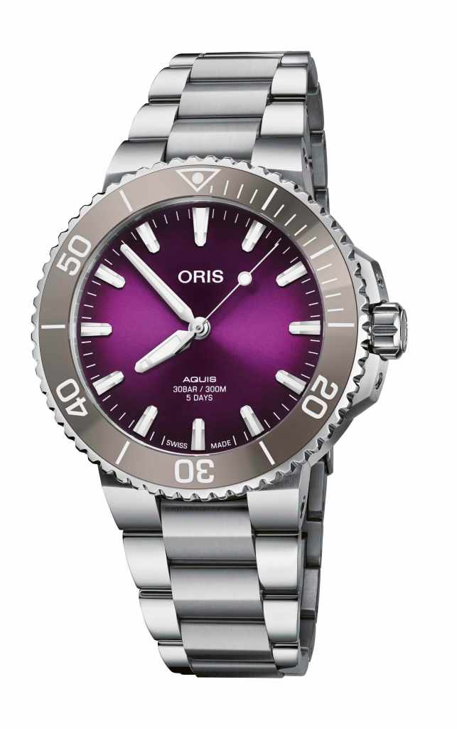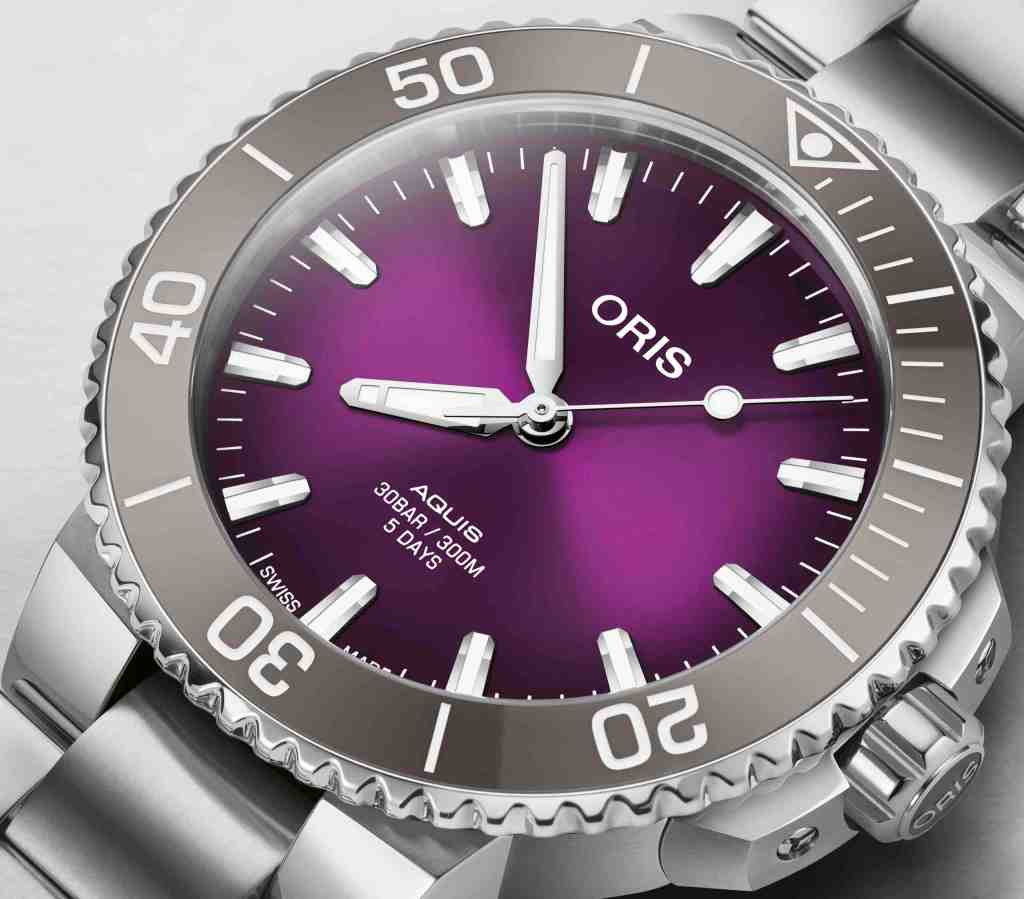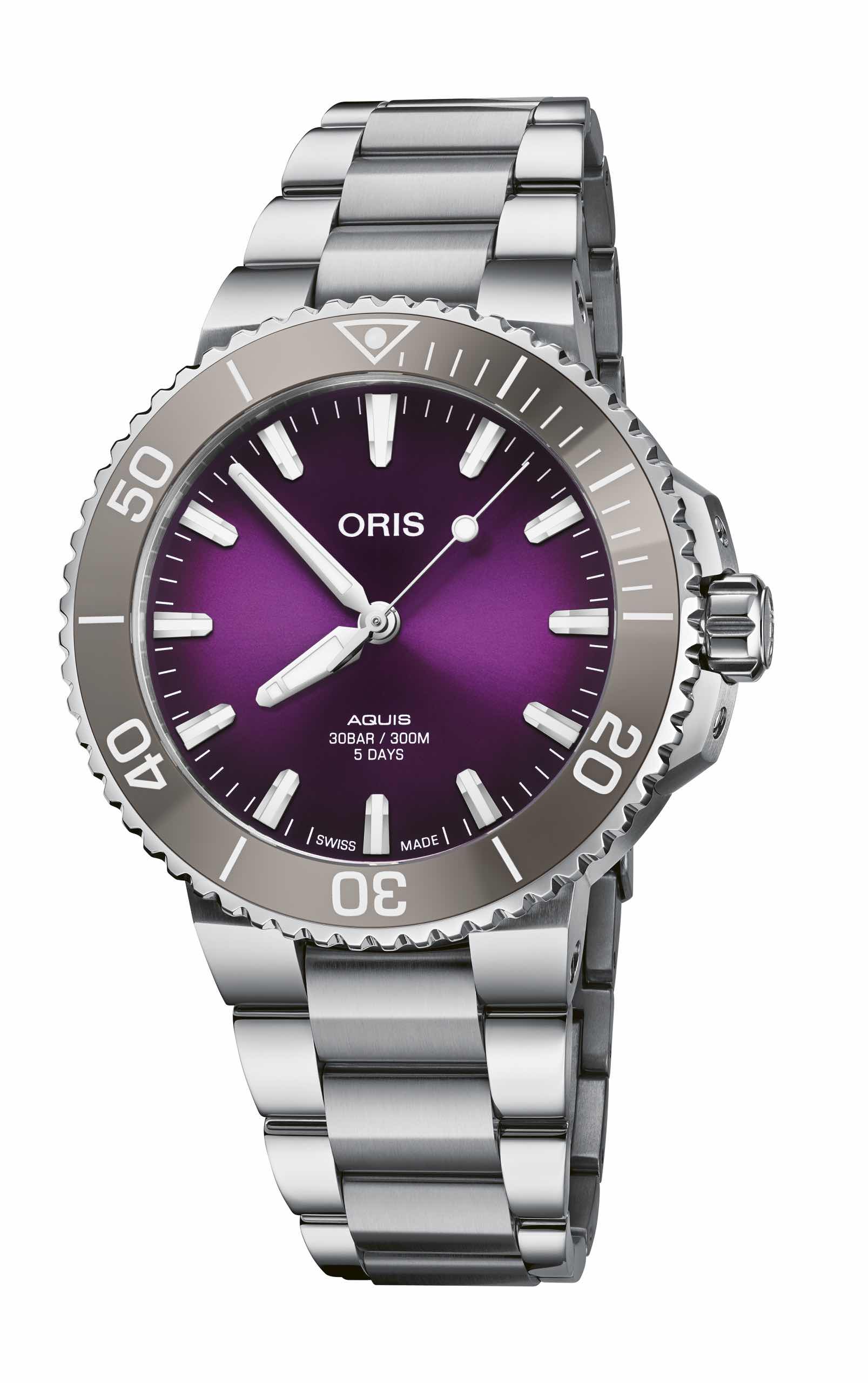La combinación del popular Aquis sin fecha y una esfera morada muestra la capacidad de Oris para escuchar y responder a las solicitudes de su comunidad.
