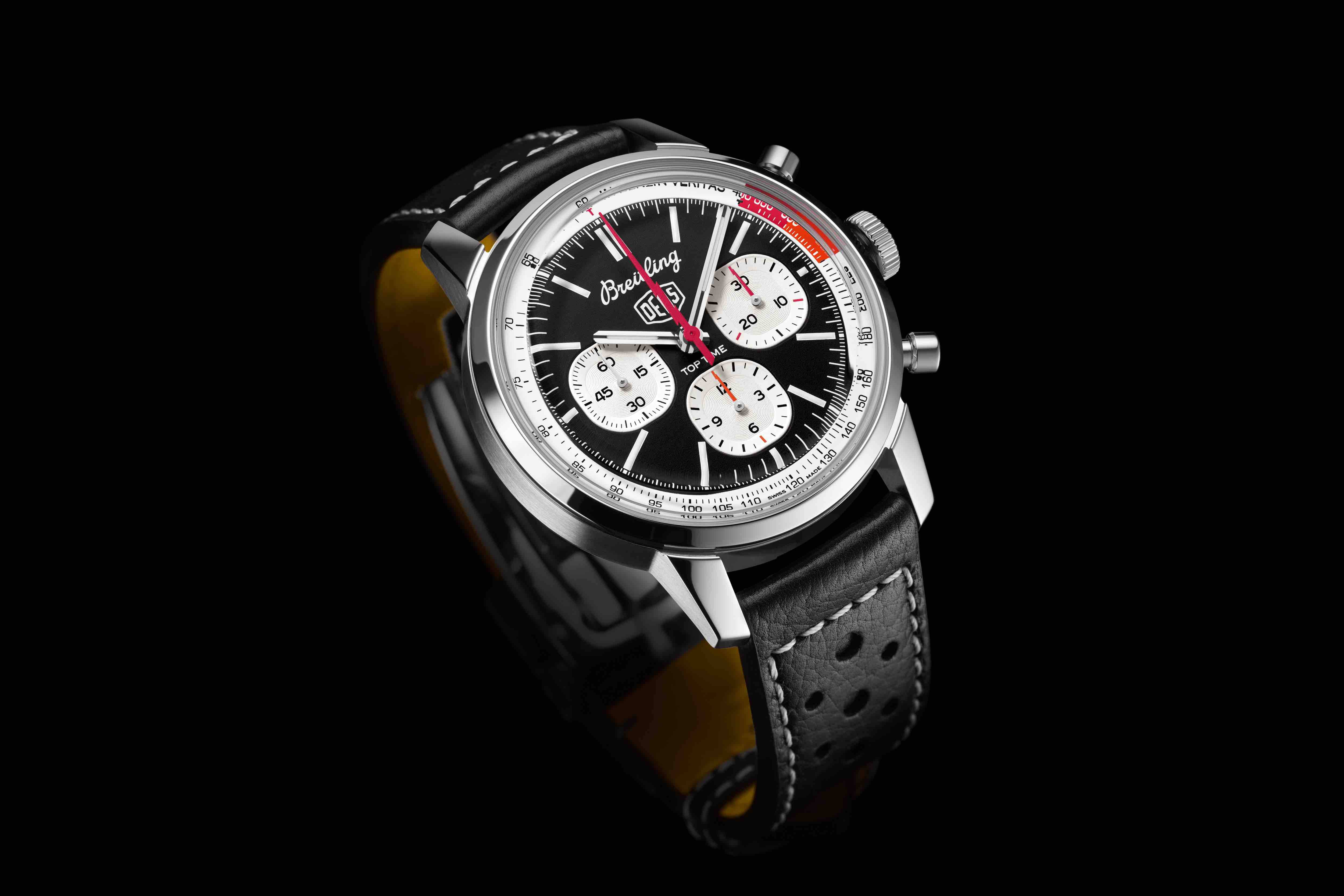Comenzando con el Top Time Deus, esta tercera entrega de la colaboración entre Breitling y la marca australiana Deus Ex Machina promete ser un auténtico deleite para los amantes de la estética monocromática. Con una esfera negra que contrasta con las subesferas de triple registro y la escala de taquímetro en blanco, este reloj destaca por su elegancia y sobriedad. Es posible elegir entre una correa de piel de becerro negra inspirada en el mundo de las carreras o un brazalete metálico.