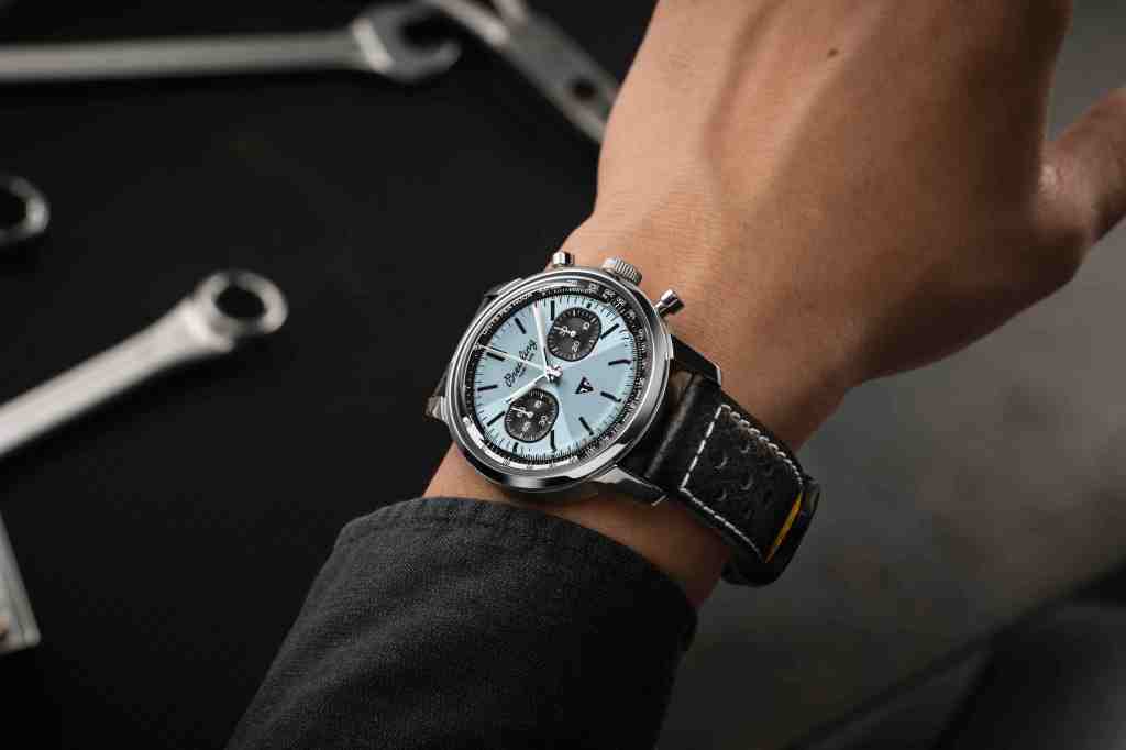 Pasando al Top Time Triumph, Breitling continúa su exitosa colaboración con el fabricante de motocicletas británico. Esta vez, el reloj se presenta en una versión que forma parte de la colección principal de Breitling. El Top Time Triumph cuenta con una esfera de color azul hielo, inspirada en la Triumph Thunderbird 6T de 1951 y en un icónico Breitling Top Time Ref. 815 de la década de 1970.