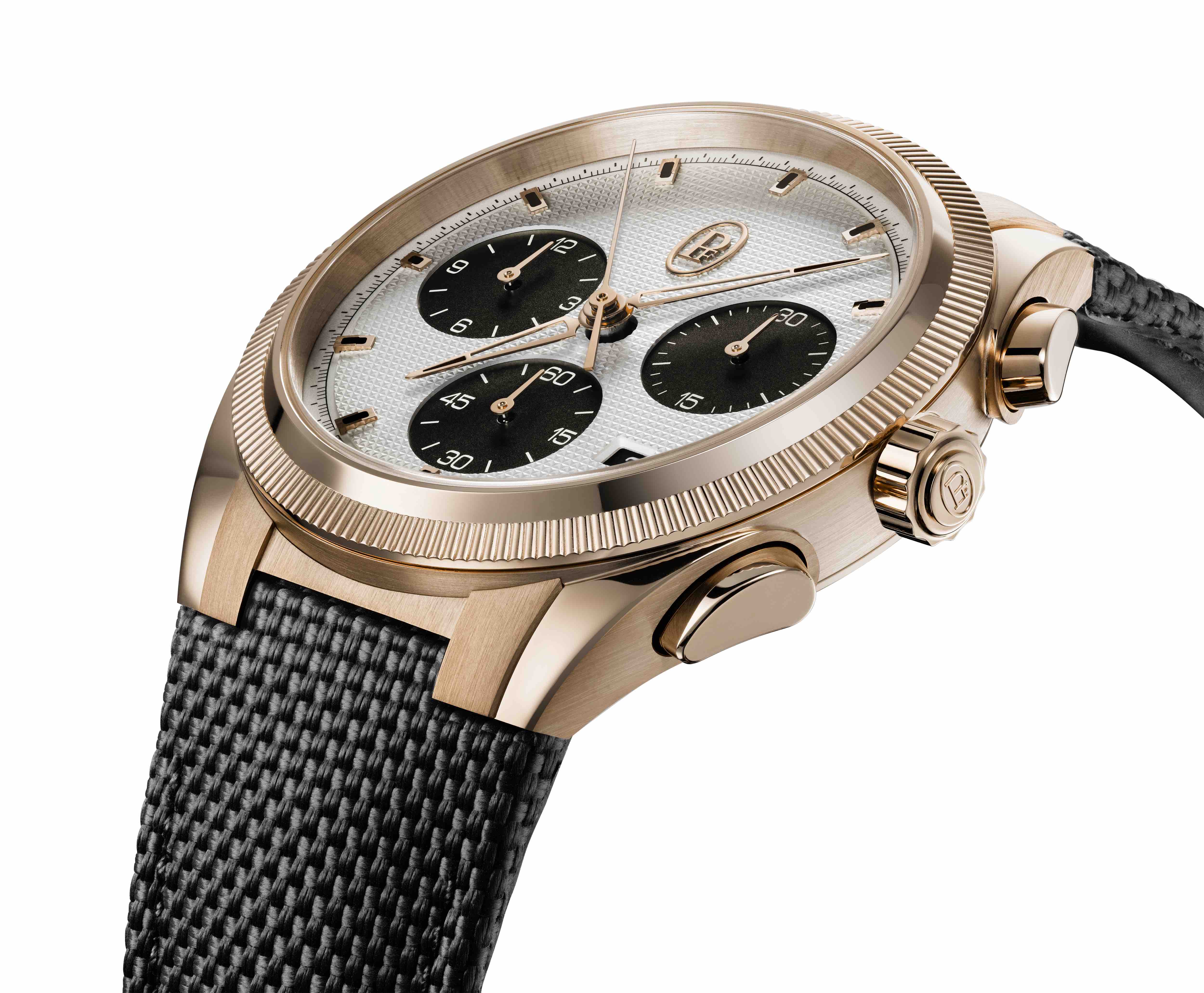 El bisel estriado cuenta con 160 incisiones, creando un juego de luz y reflejo más audaz que resalta su carácter deportivo. La esfera está decorada con un patrón de guilloché «uña triangular» realizado a mano, una técnica artesanal centenaria que crea una superficie texturizada y realza los efectos de la luz que incide en ella desde diferentes ángulos.