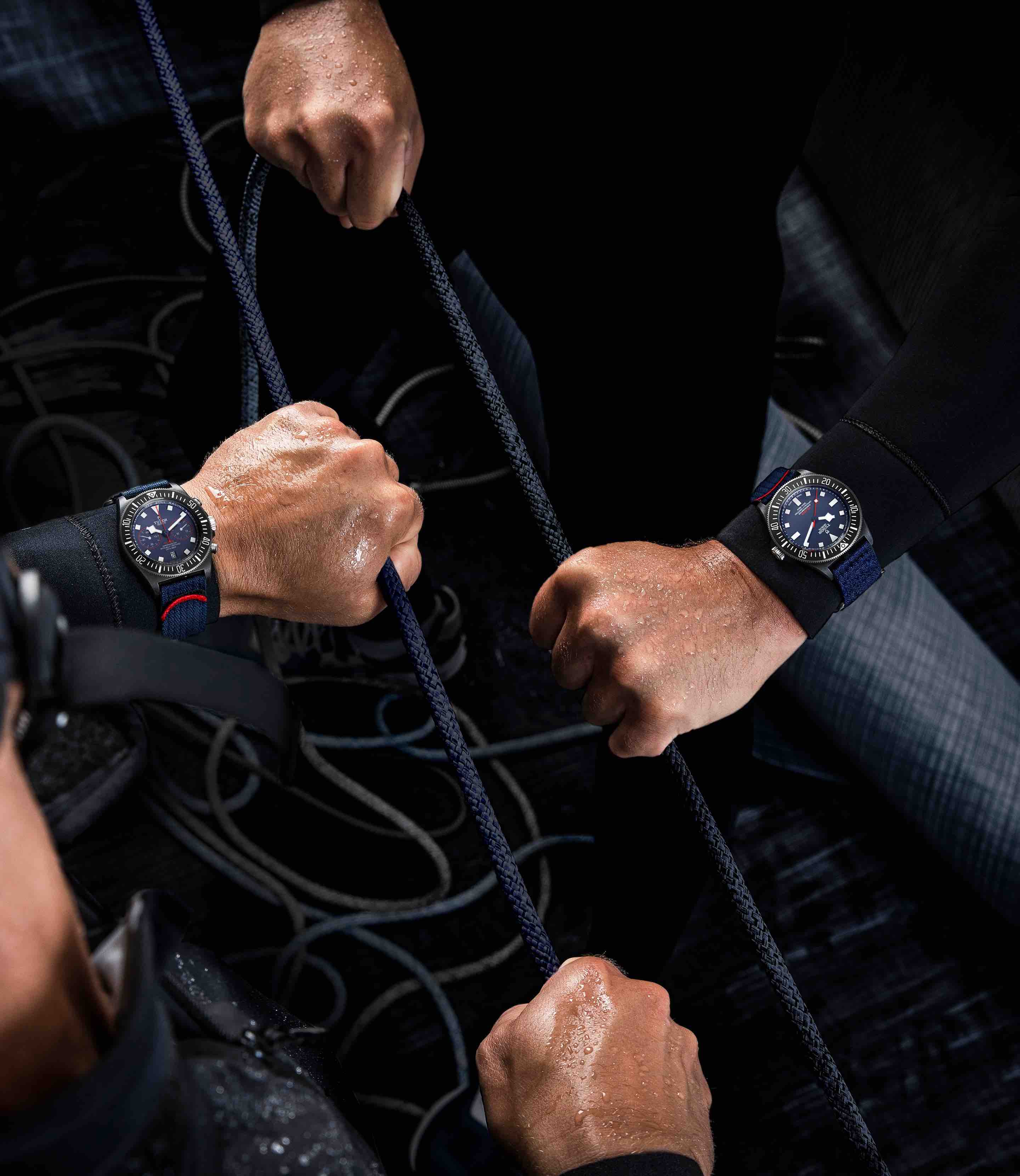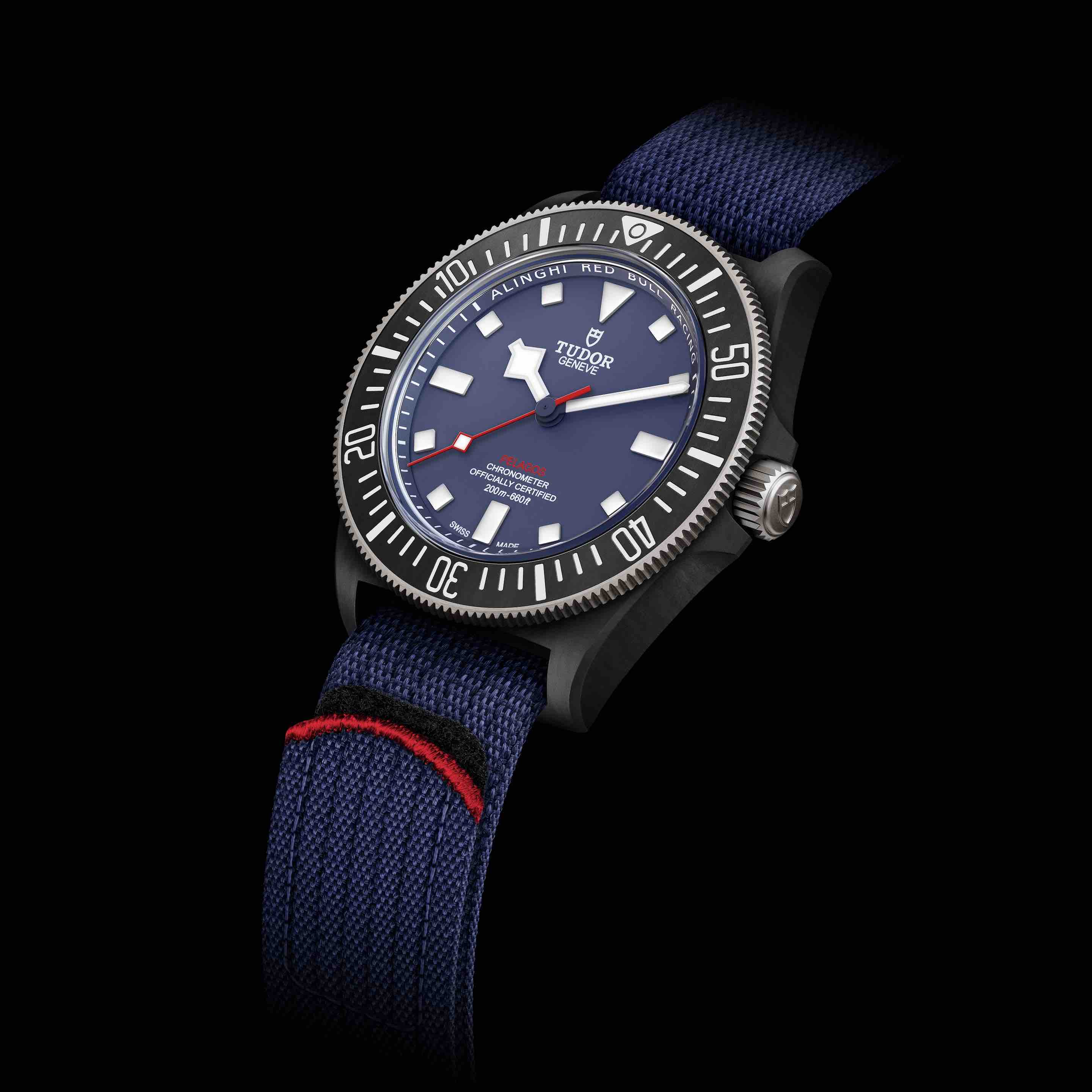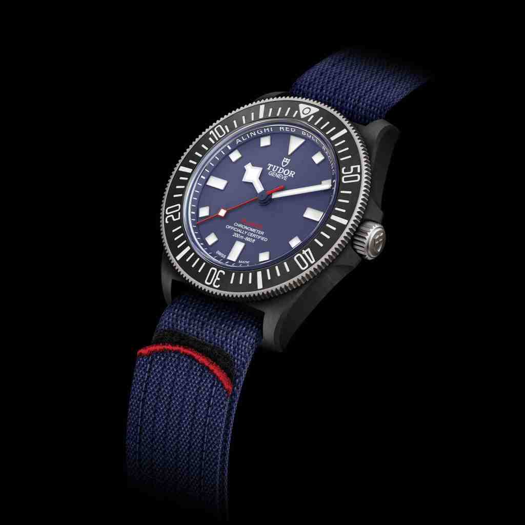 No podemos dejar de mencionar la correa de tejido de una sola pieza, una de las señas de identidad de TUDOR. Fabricada en Francia en telares Jacquard del siglo XIX, esta correa es conocida por su calidad, robustez y comodidad en la muñeca. Para los modelos Pelagos FXD, TUDOR y Julien Faure han desarrollado una confección de correa técnica que combina tonos de azul y rojo, inspirados en el Alinghi Red Bull Racing.