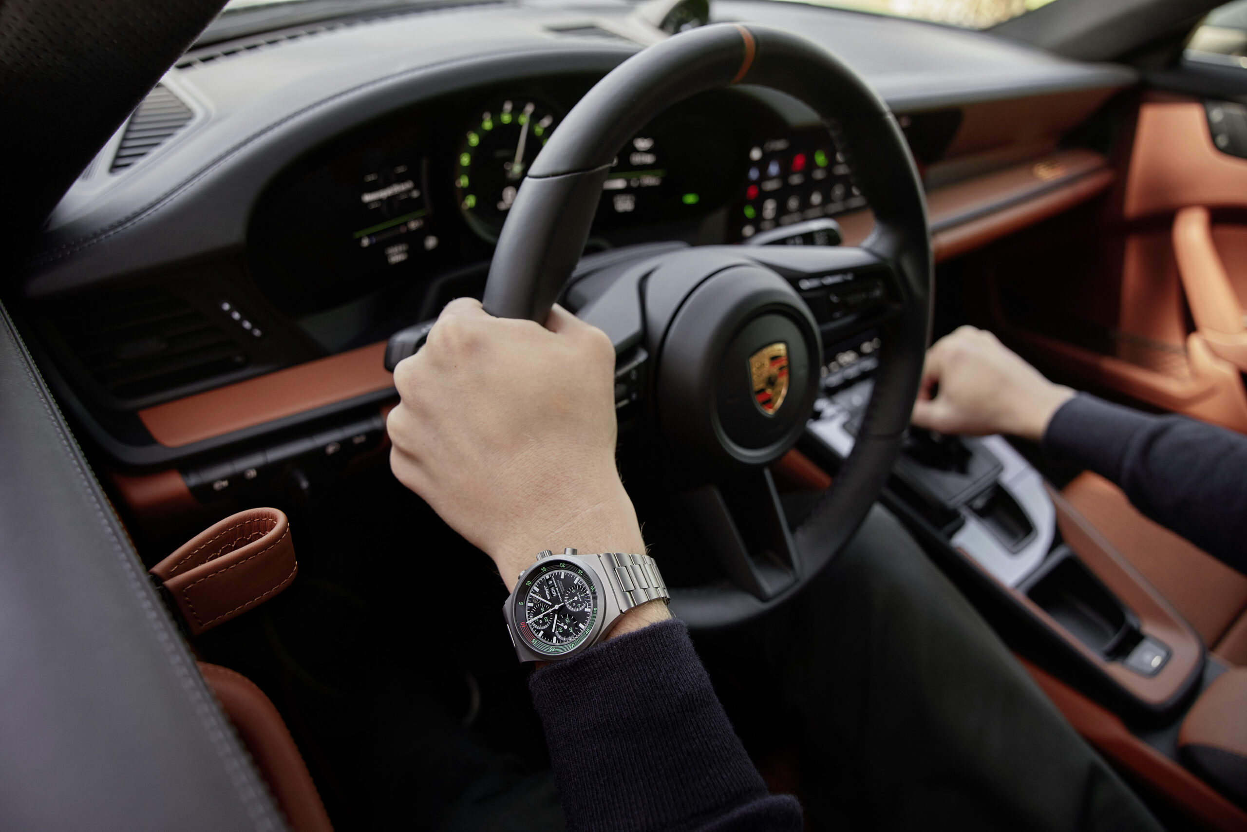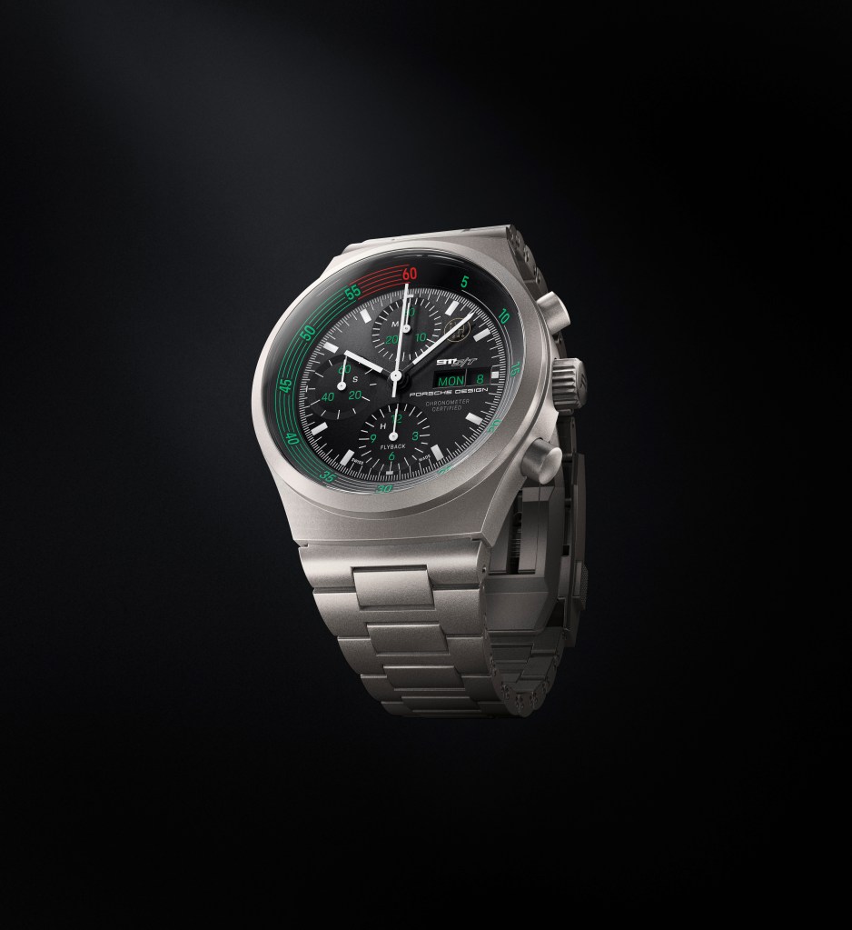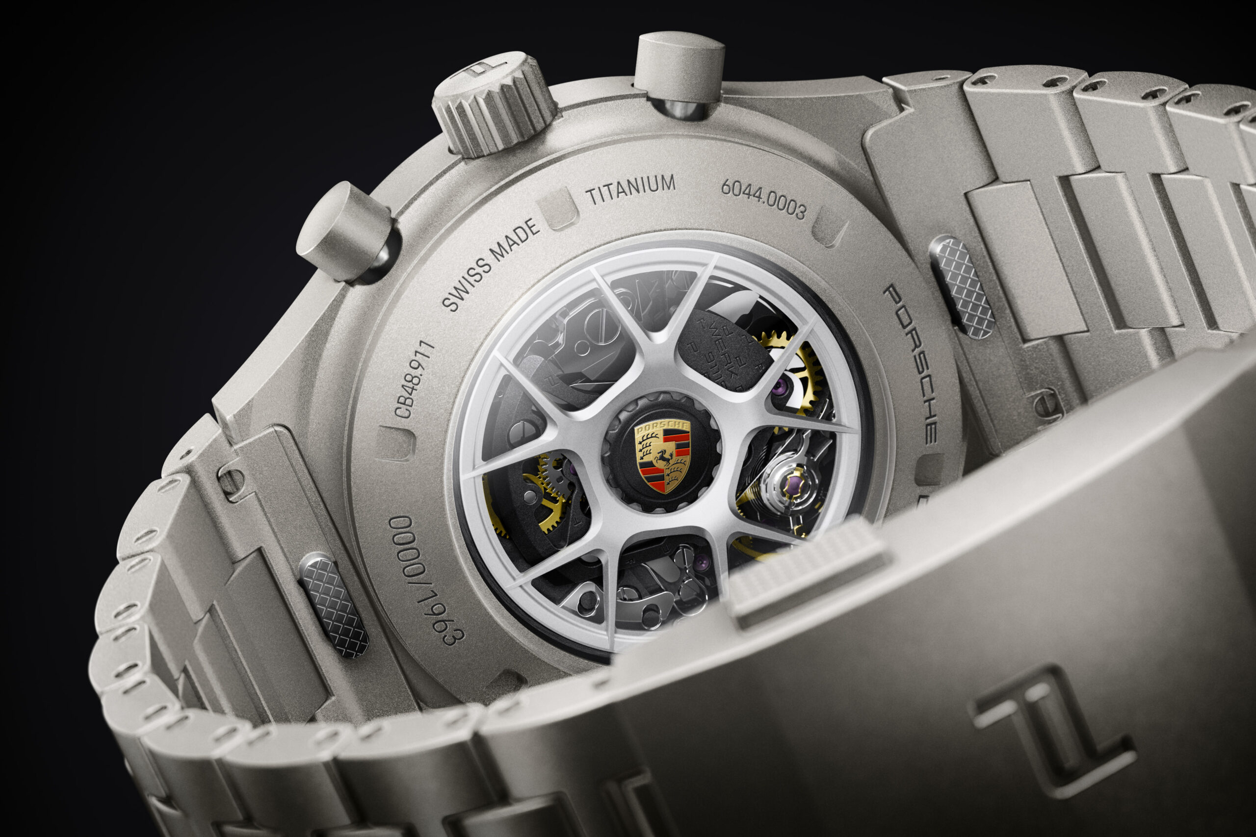 La función de retroceso permite iniciar, detener y reiniciar de manera rápida y sencilla con una sola operación. El movimiento es visible a través de la tapa de la caja trasera de zafiro antirreflectante de siete capas, impulsado por un rotor que recuerda el diseño de la rueda de aleación de magnesio del 911 S/T.