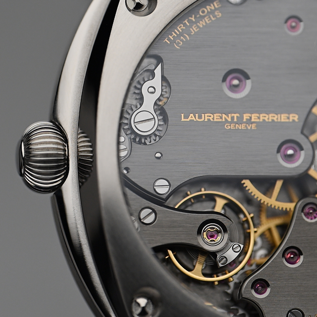 En el corazón de este reloj late el calibre LF270.01, el segundo movimiento automático de la marca con calendario. Este movimiento, completamente diseñado y decorado a mano en los talleres de Laurent Ferrier, ofrece una reserva de marcha de más de 72 horas cuando está completamente cargado. Es un calibre robusto y preciso, diseñado para resistir impactos y vibraciones, lo que lo convierte en un compañero confiable tanto en la pista como en la vida diaria.