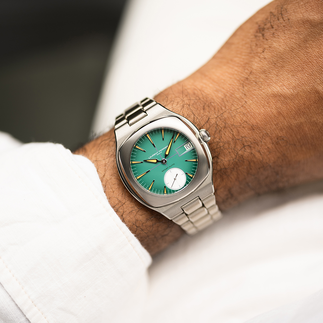 El Sport Auto 40 te ofrece la oportunidad de llevar contigo un pedazo de historia del automovilismo en la muñeca. Este reloj rinde homenaje al legendario Porsche 935 Turbo No. 40, con un dial en los colores de este icónico auto de carreras. La esfera verde viridiana con un acabado opalino y laca semi brillante está decorada con una transferencia de color fucsia que forma una cruz en el centro, un guiño al automóvil original. El número «40», como un recordatorio de la gesta en Le Mans, orgullosamente adorna la esfera de los segundos a las 6 en un blanco opalino.