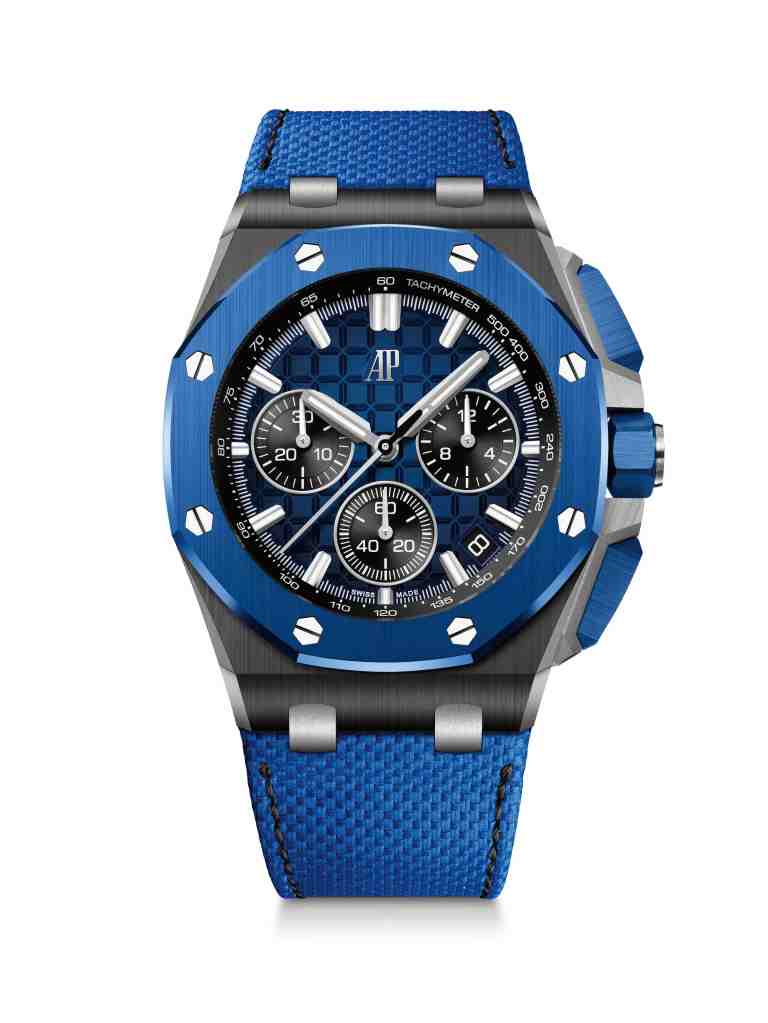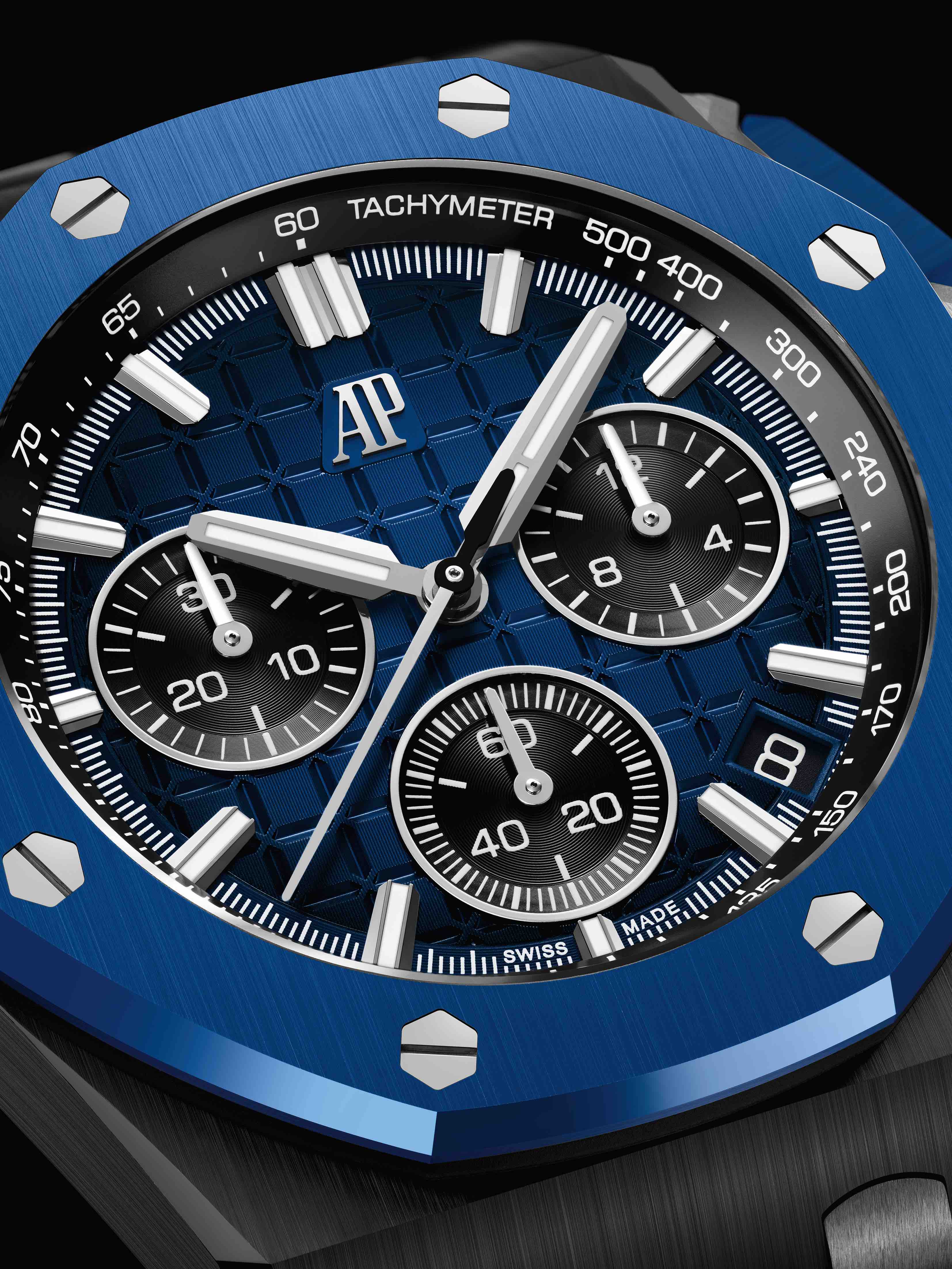 Esfera azul ahumado con motivo «Méga Tapisserie», zona exterior y contadores negros, índices aplicados y agujas Royal Oak de oro blanco con revestimiento luminiscente, realce negro.
