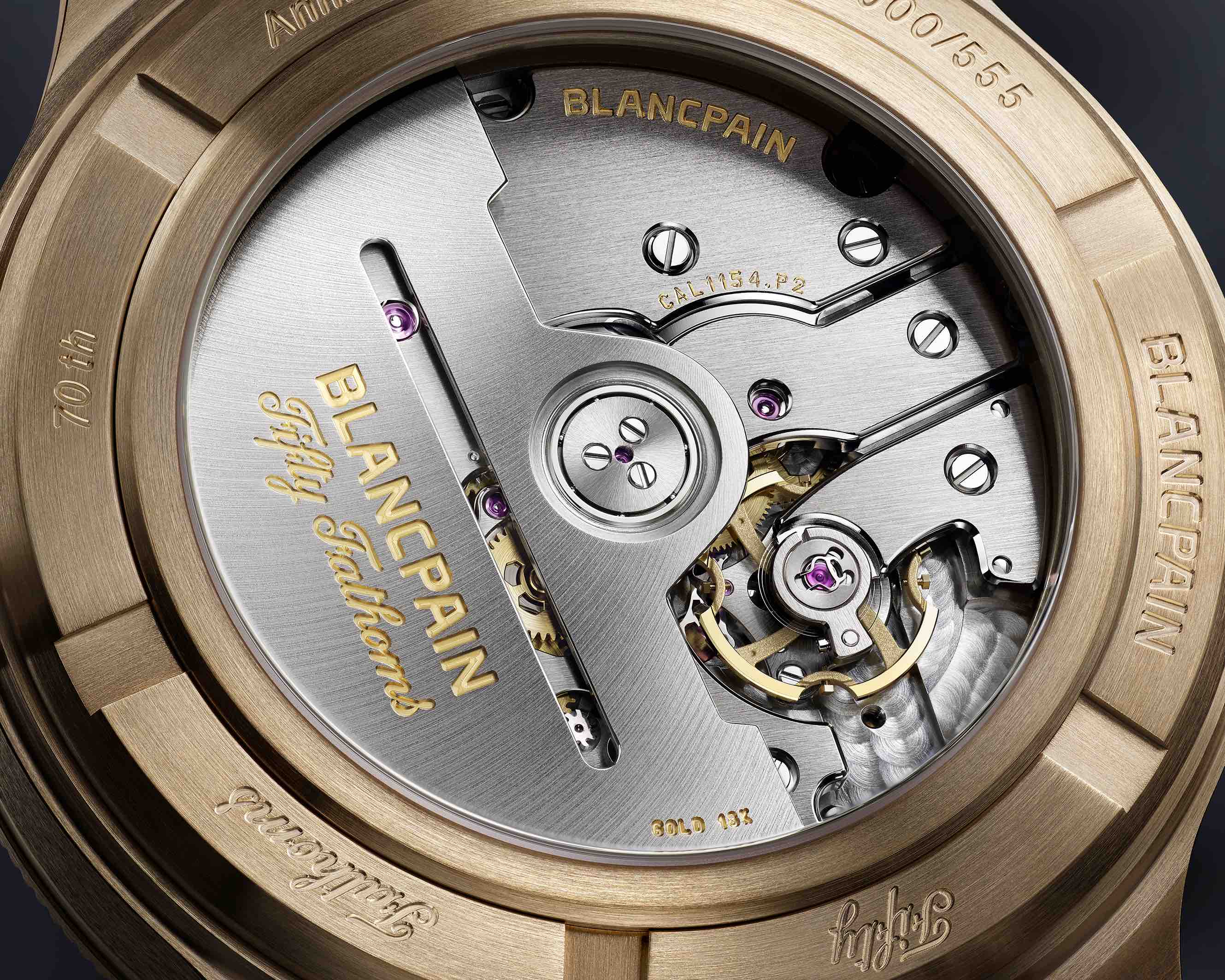 La caja del Fifty Fathoms 70th Anniversary Act 3 alberga el movimiento 1154.P2. Este movimiento cuenta con un doble barrilete que proporciona una impresionante reserva de marcha de 100 horas, y una espiral de silicio para protegerlo del magnetismo. Por primera vez, Blancpain ofrece una versión de su movimiento de 1000 gauss gracias al uso de este material junto con aleaciones exclusivas para el escape. Esto representa una mejora significativa en comparación con la versión original, en la que la resistencia a los campos magnéticos solo se lograba mediante una caja interna de hierro dulce.