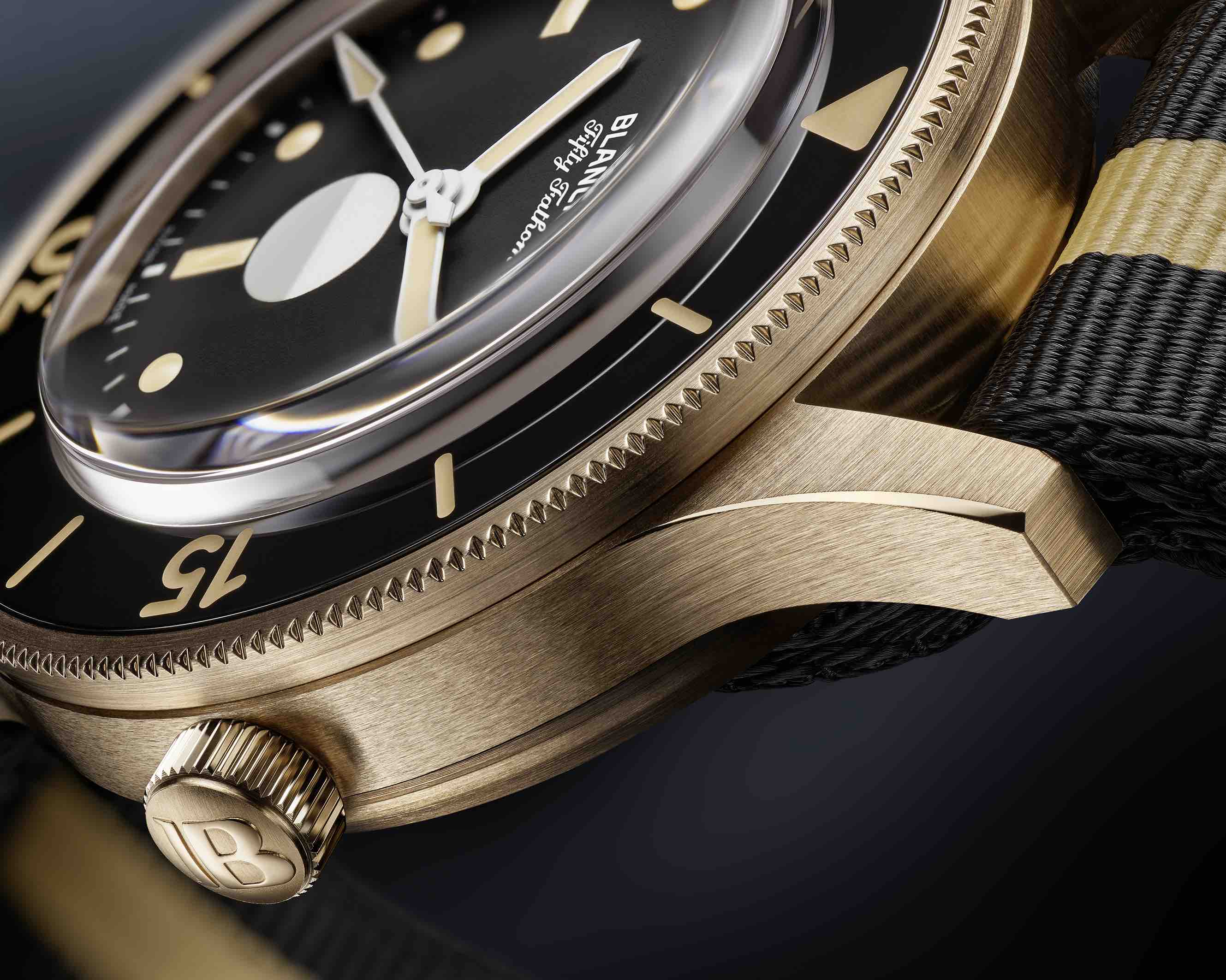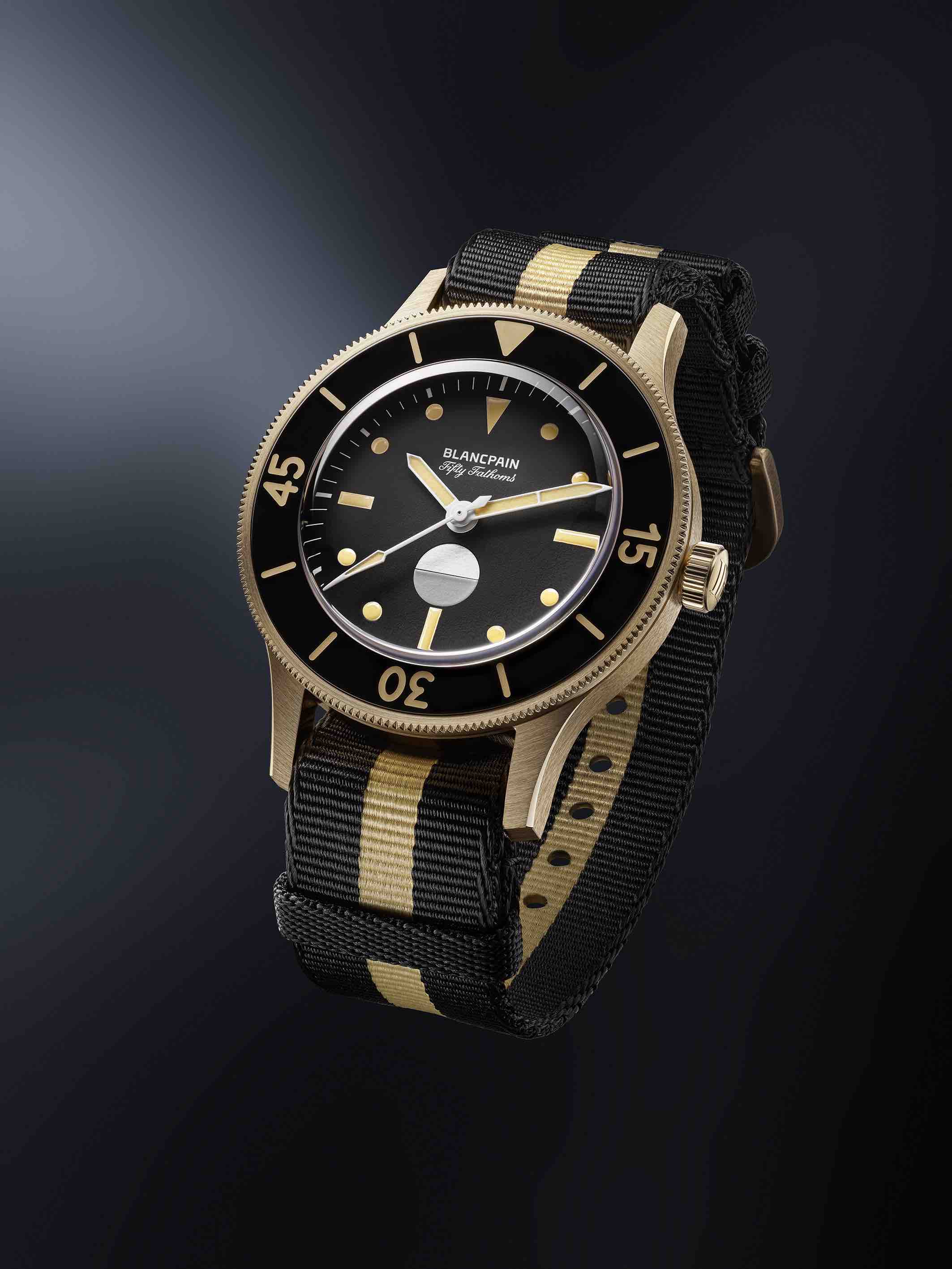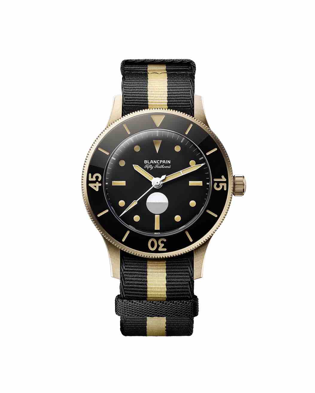 Ahora, Blancpain presenta el tercer acto del 70º aniversario de su icónico reloj. Este guardatiempos se inspira claramente en el modelo MIL-SPEC utilizado por la Marina estadounidense. Los detalles que revelan su parentesco incluyen una esfera negra mate con la pastilla de hermeticidad y los índices con Super-LumiNova® vintage, un bisel giratorio unidireccional con inserción de cerámica negra y una correa NATO bicolor que recupera el código de color del modelo original.
