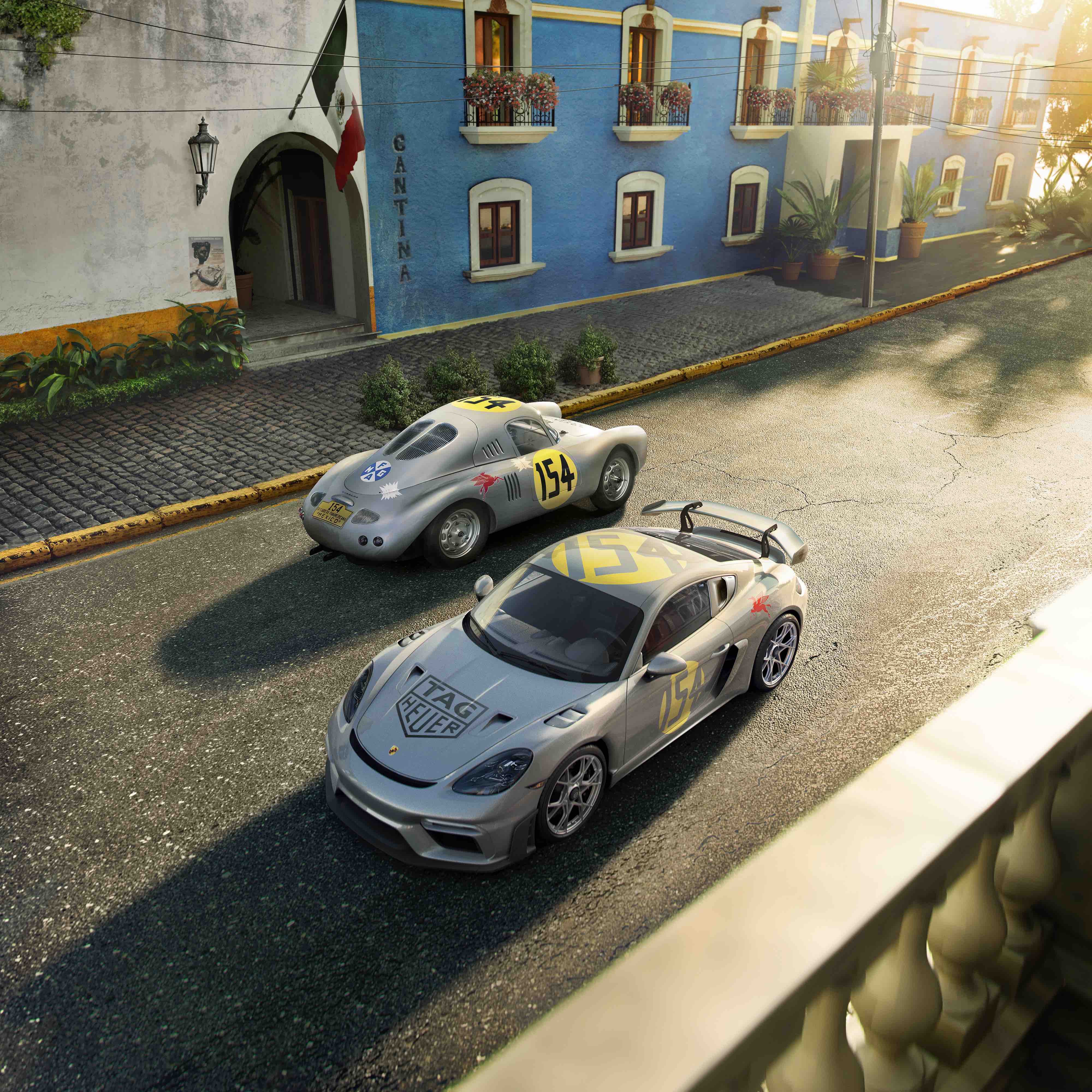 Porsche y TAG Heuer han sido socios durante muchos años, comenzando con una asociación a largo plazo en el automovilismo, seguida de varios lanzamientos colaborativos de relojes y culminando en el desarrollo de un proyecto de automóvil exclusivo. El proyecto «TAG Heuer x Porsche – Legends of Panamericana» está inspirado en el Porsche 550 Coupé en el que dos equipos de clientes compitieron en la Carrera Panamericana en 1953. Está basado en el 718 Cayman GT4 RS, un automóvil sin concesiones que impresiona con su construcción ligera, ajuste excepcional del chasis y aerodinámica sofisticada.