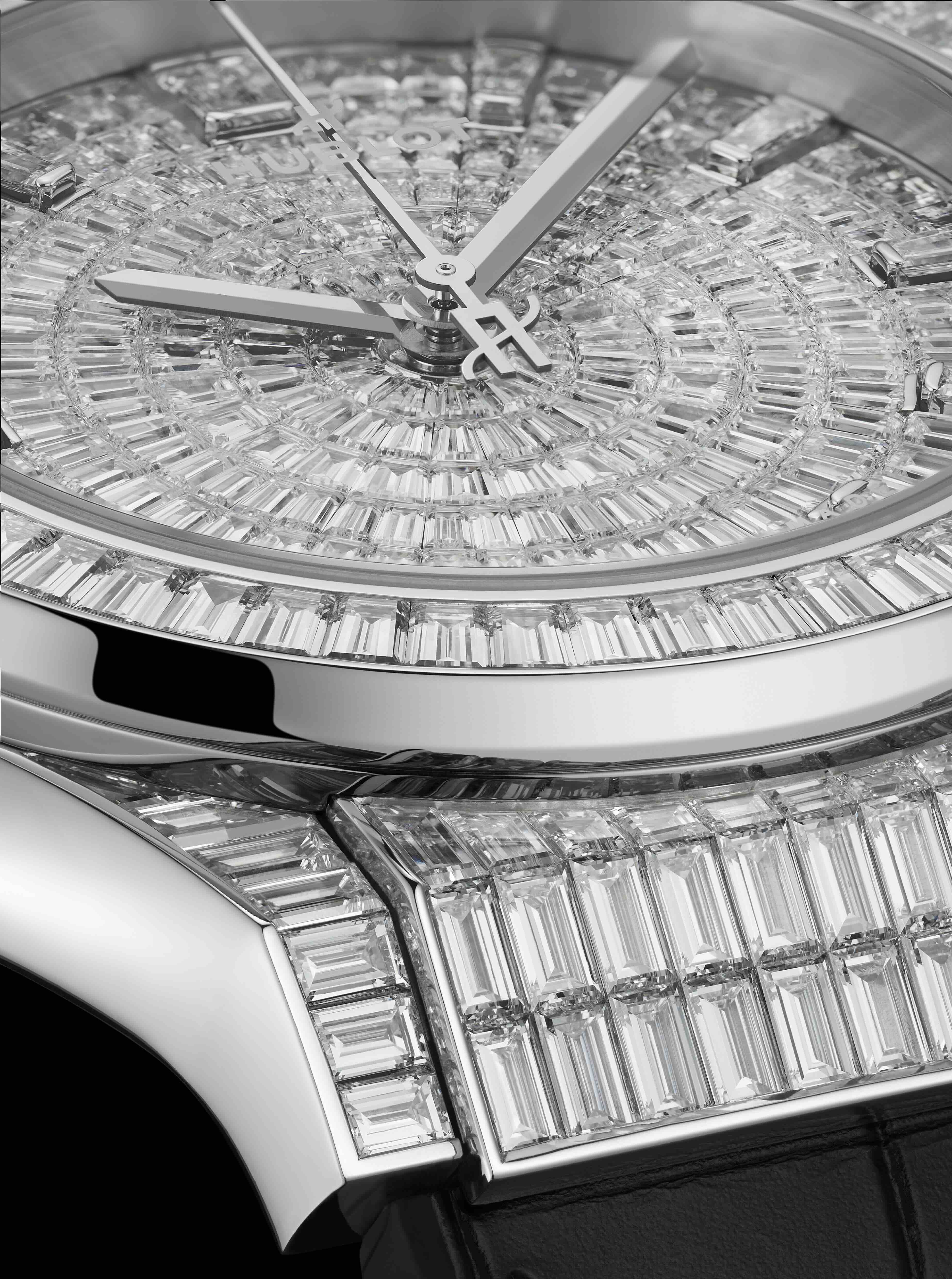 Cada detalle de este reloj está meticulosamente trabajado. El reloj presenta un diseño icónico, con líneas de oro blanco que realzan la belleza de los diamantes. La caja de 42 mm alberga un total de 431 diamantes talla baguette, que adornan la caja, el bisel, la esfera y el cierre. ¿Pueden creer que se necesitaron casi tres semanas para engastar todos estos diamantes?